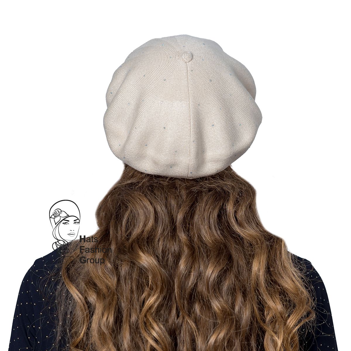 Молодежный двойной берет. По окружности головы украшен россыпью страз разного диаметра в цвет изделия и фирменной шильдой.