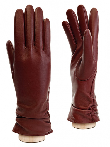 Перчатки торговой марки ELEGANZZA производства Китай. Изготовлены из натуральной кожи ягнёнка. Подкладка - шелк. Отделка - модель украшена V-образным вырезом на лицевой части манжеты с декоративными элементами из кожи по форме выреза и отстрочкой в тон. Длина манжеты от нижней точки большого пальца до края перчаток составляет 2,5 см. Длина пальцев - средняя.
