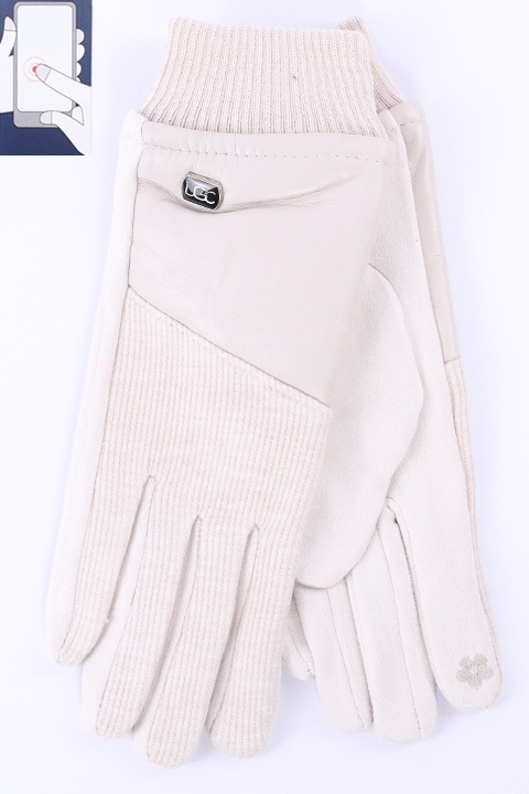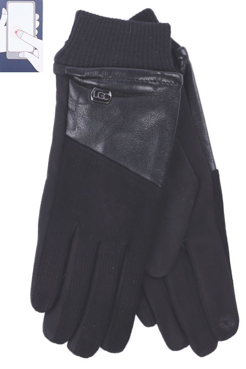 Перчатки женские сенсорные (нашивка на кончике указательного пальца). Комбинированные: ладонь иск.замша на велюровой основе. Сверху - трикотаж на подкладе велюр и вставка из эко-кожи.