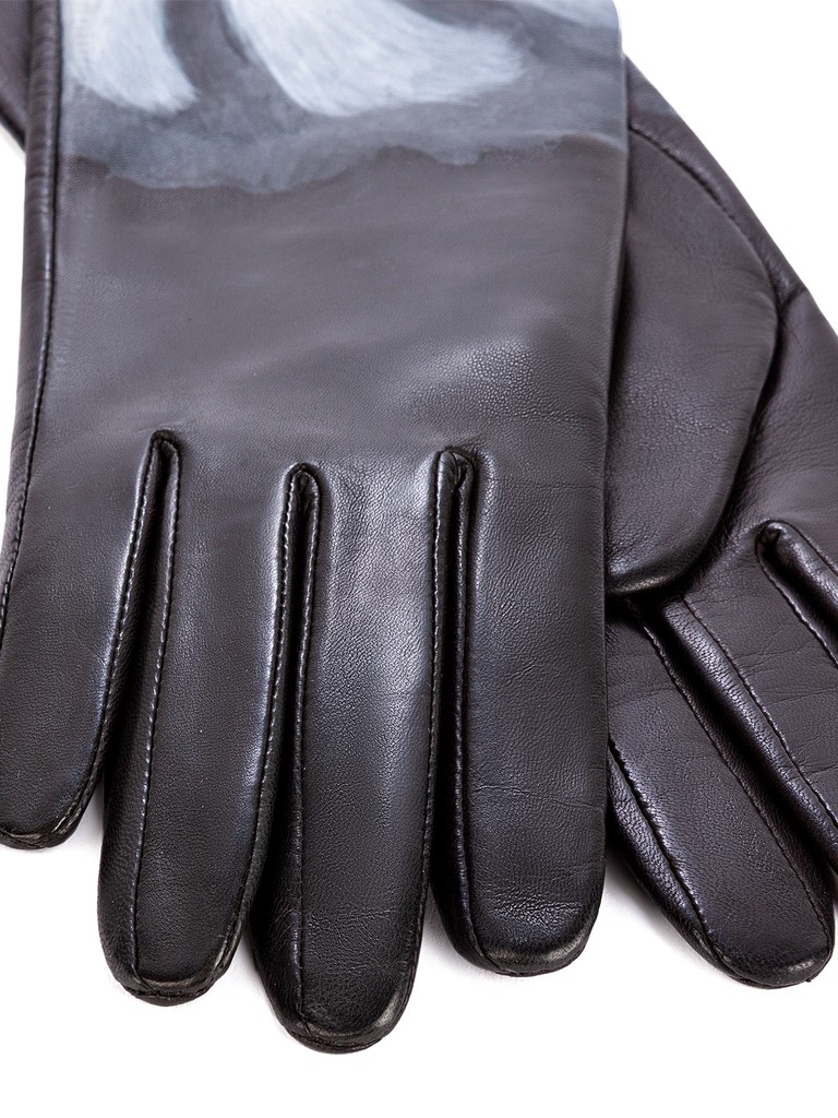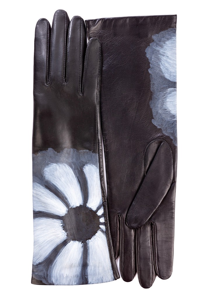 Перчатки женские торговой марки ELEGANZZA из натуральной кожи ягненка. Производство Филиппины. Подкладка: натуральный шелк. Отделка - уникальная роспись на каждой перчатке вручную. Длина манжеты от нижней точки большого пальца до края перчаток - 15 см. Длина пальцев - средняя.