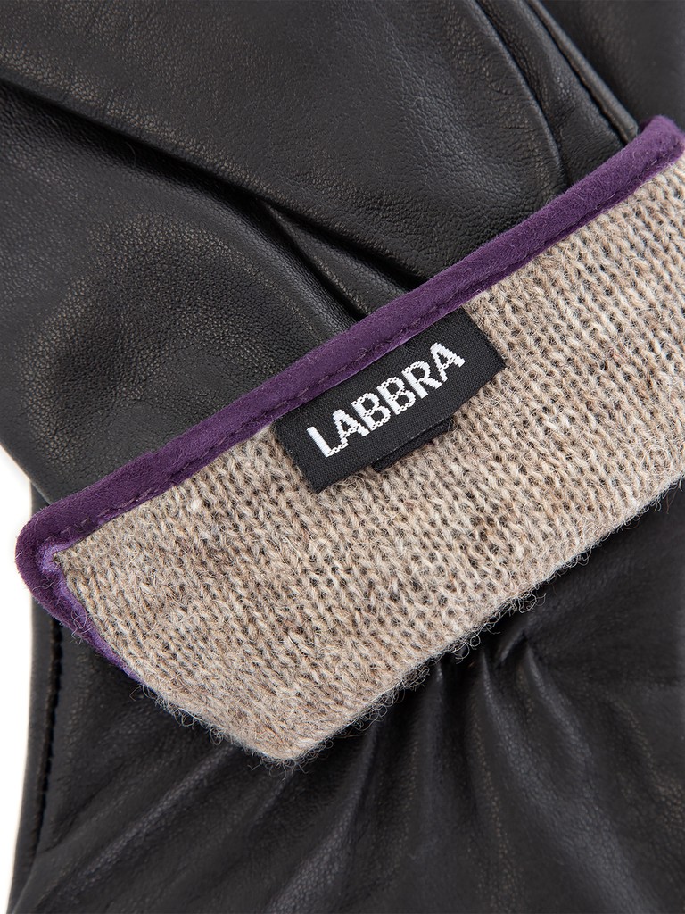 Перчатки женские торговой марки LABBRA из натуральной кожи ягненка. Производитель Китай. Подкладка: 70% шерсть, 30% акрил. Отделка - кант контрастного цвета на боковой части по линии мизинца и линии манжета, выполненный из велюра; фирменная фурнитура LABBRA. Длина манжеты от нижней точки большого пальца до края перчаток - 5,5 см. Длина пальцев - средняя.
