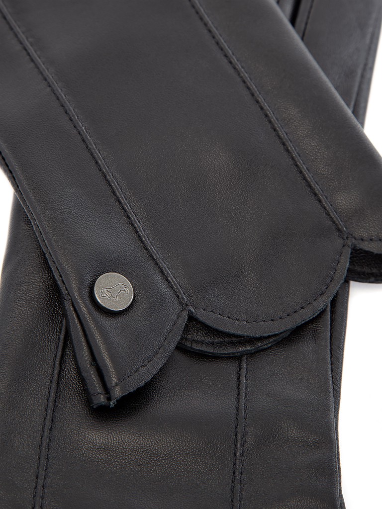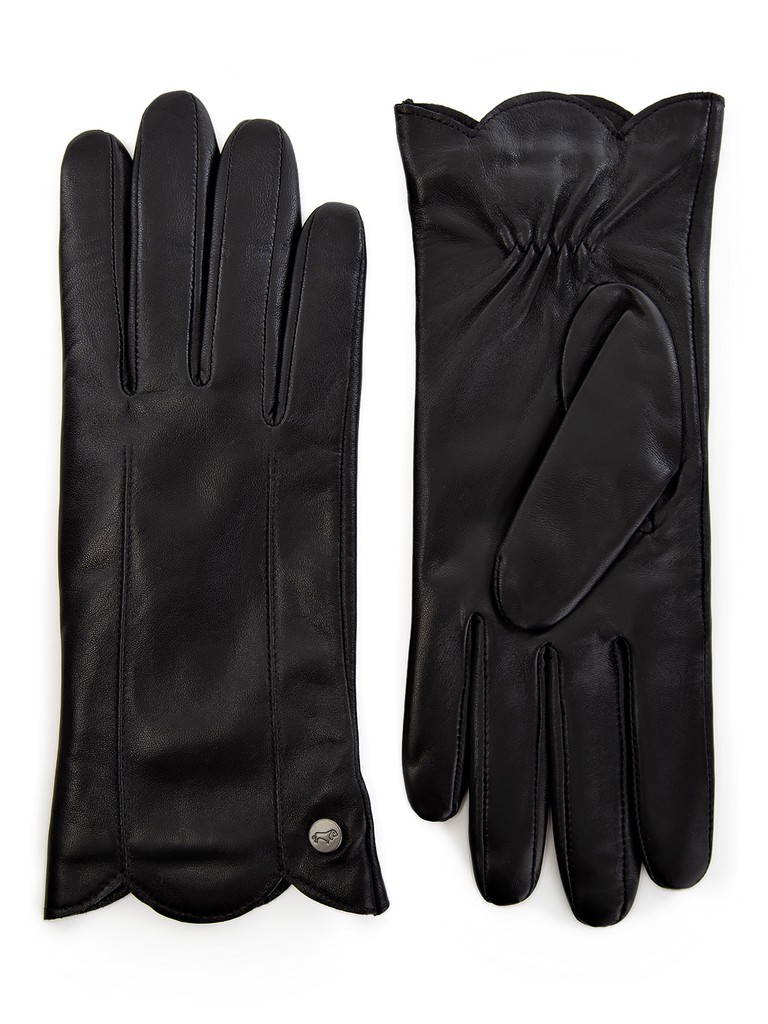 Перчатки торговой марки LABBRA из натуральной кожи ягненка. Производитель Китай. Подкладка: 70% шерсть, 30% акрил. Отделка - симметричная отстрочка на лицевой стороне, фигурная линия манжеты декорированная фирменной фурнитурой. Длина манжеты от нижней точки большого пальца до края перчаток - 5.5 см. Длина пальцев - укороченные.