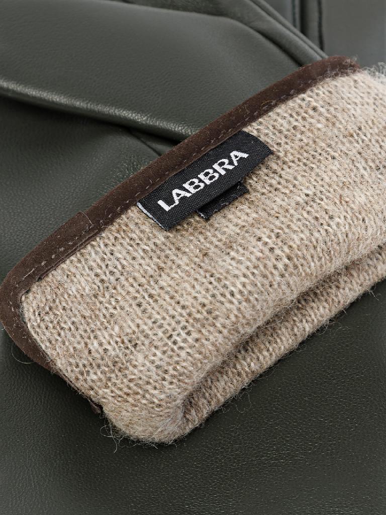 Перчатки женские торговой марки LABBRA из натуральной кожи ягненка. Производитель Китай. Подкладка: 70% шерсть, 30% акрил. Отделка - кант контрастного цвета на боковой части по линии мизинца и линии манжета, выполненный из велюра; фирменная фурнитура LABBRA. Длина манжеты от нижней точки большого пальца до края перчаток - 5,5 см. Длина пальцев - средняя.