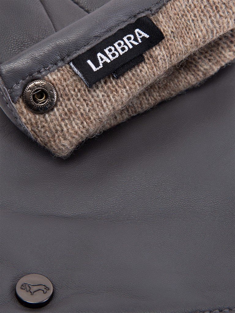 Перчатки торговой марки LABBRA из натуральной кожи ягненка. Производитель Китай. Подкладка: 70% шерсть, 30% акрил. Отделка - декоративная фурнитура с фирменной символикой; разрез на ладонной части на рабочей кнопке. Длина манжеты от нижней точки большого пальца до края перчаток - 5 см. Длина пальцев - средняя.