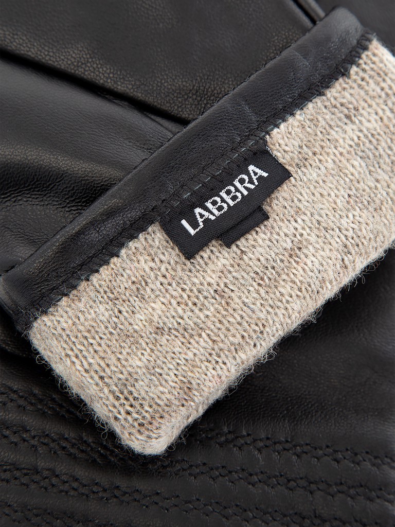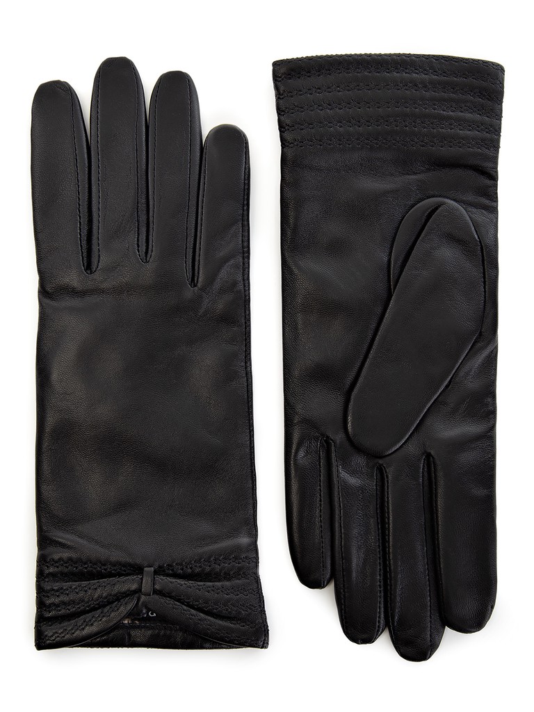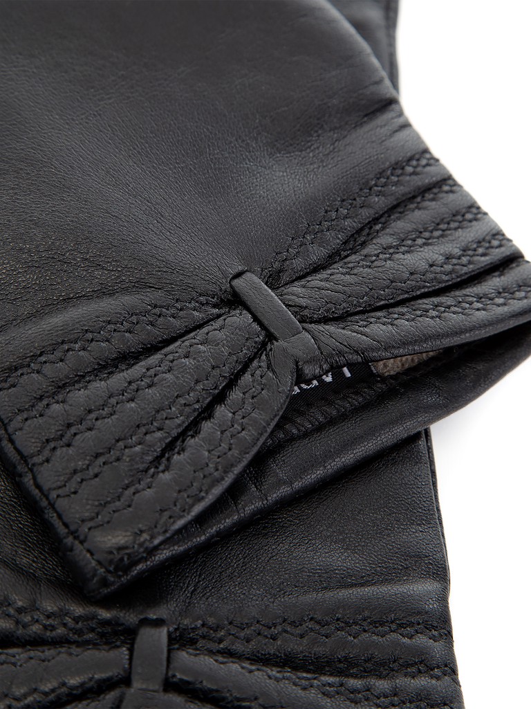Перчатки женские торговой марки LABBRA из натуральной кожи ягненка. Производитель Китай. Подкладка: 70% шерсть, 30% акрил. Отделка - декоративная строчка на лицевой части, сдрапированная по центру тонким кожаным шнурком в форму банта. Длина манжеты от нижней точки большого пальца до края перчаток - 5,5 см. Длина пальцев - средняя.