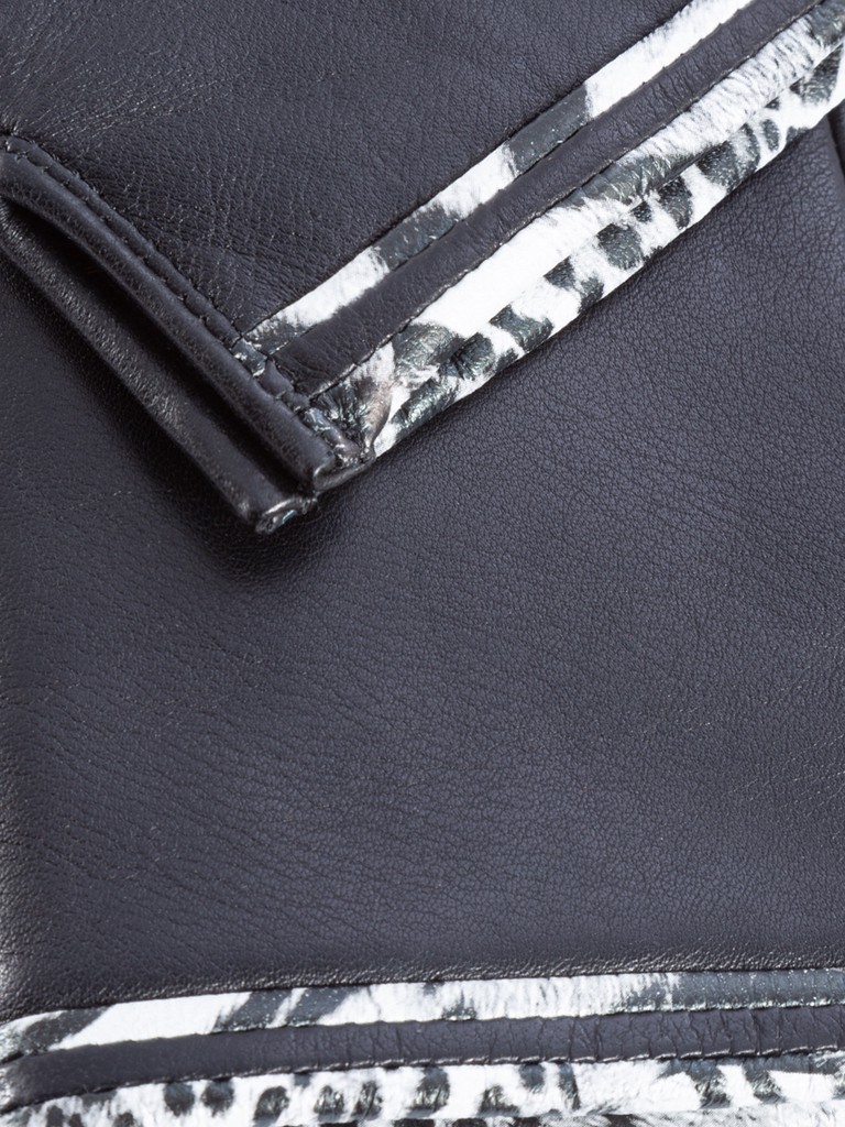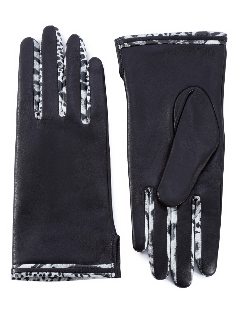 Перчатки торговой марки ELEGANZZA производства Китай выполнены из натуральной кожи ягненка. Подкладка: 100% шерсть. В качестве вставок в "стрелки" между пальцами, а также отделка по манжету использована кожа с анималистичным принтом черно-белого цвета. Дополнительный разрез сбоку облегчает вход. Длина манжеты от нижней точки большого пальца до края перчаток составляет 5 см. Длина пальцев - средняя.