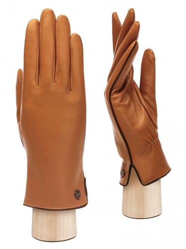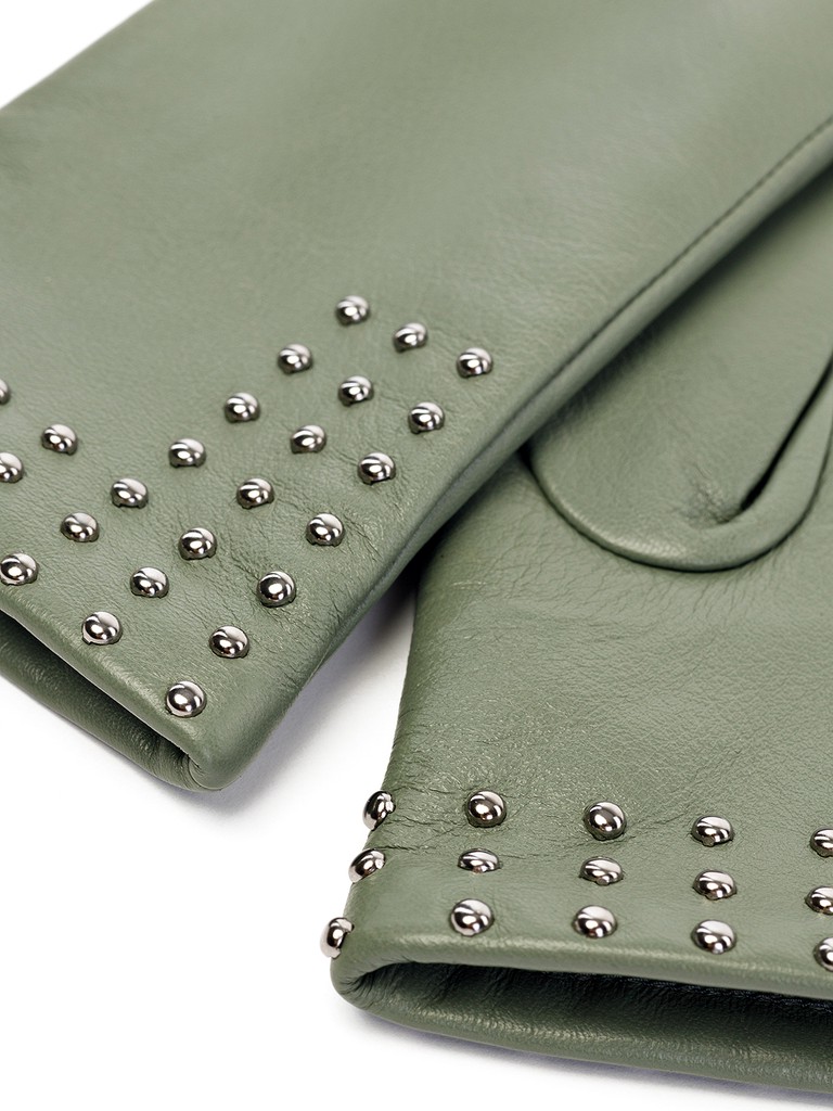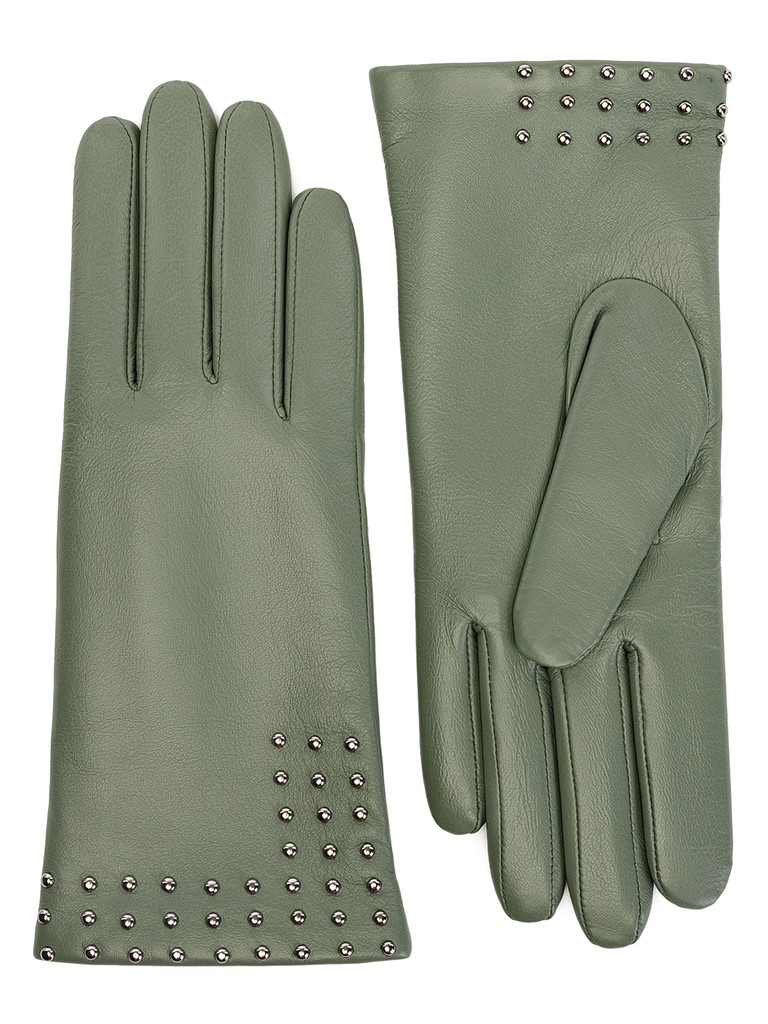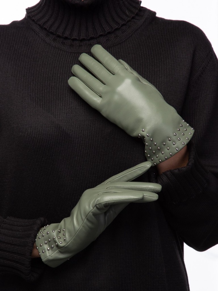 Перчатки женские торговой марки LABBRA производства Китай. Выполнены из натуральной кожи ягненка. Подкладка - 70% шерсть, 30% акрил. Декоративная отделка металлическими хольнитенами по линии манжеты перчатки. Длина манжеты от нижней точки большого пальца до края перчаток - 6 см. Длина пальцев - средняя.