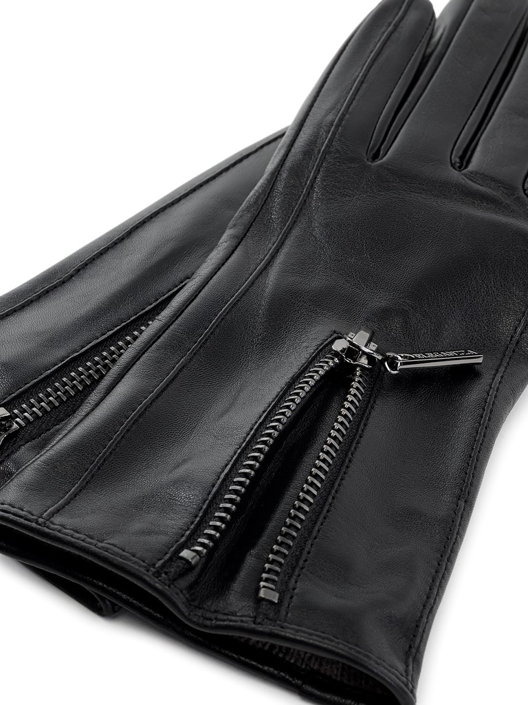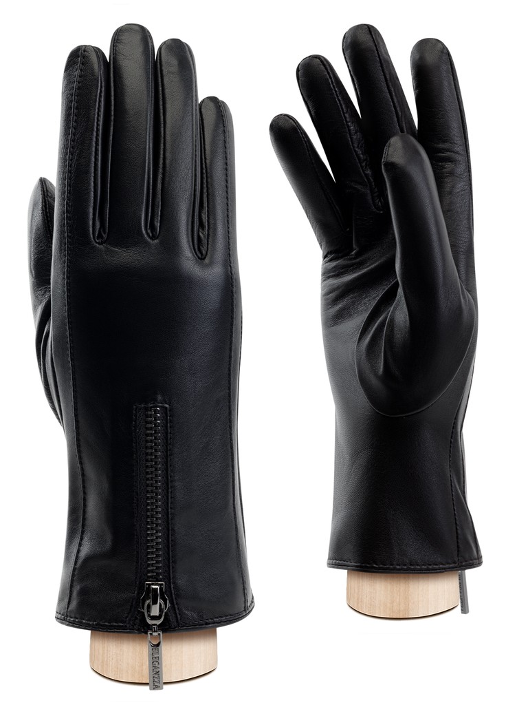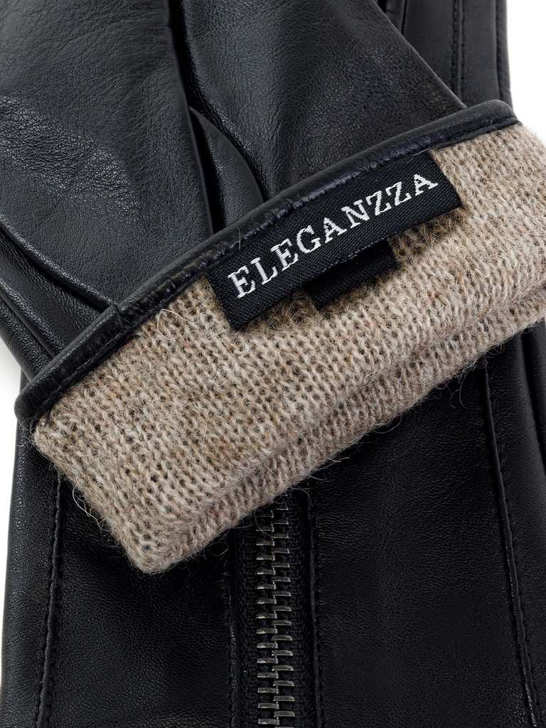 Перчатки женские торговой марки ELEGANZZA из натуральной кожи ягненка. Производство Китай. Подкладка: 100% шерсть. Отделка - декоративная молния с брендированной собачкой; с внутренней стороны молния продублирована кожей основного цвета.  Длина манжеты от нижней точки большого пальца до края перчаток - 6 см. Длина пальцев - средняя.
