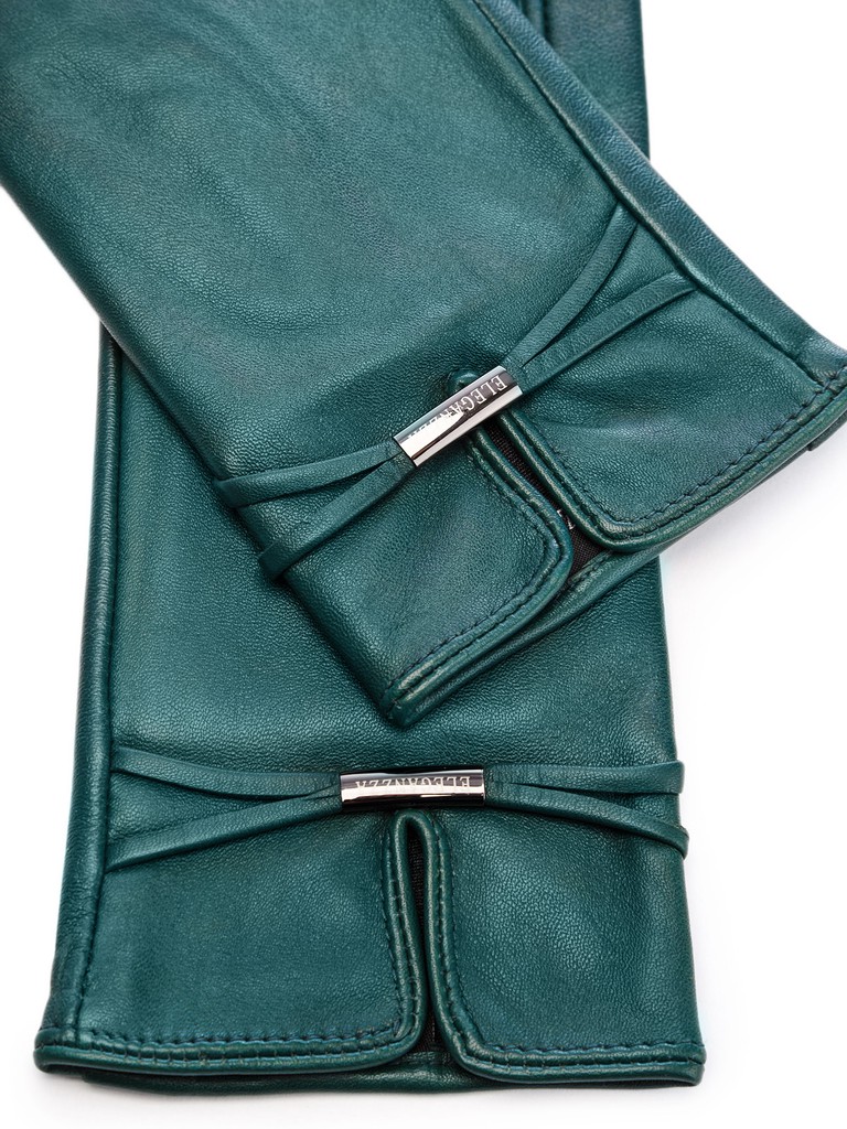 Перчатки торговой марки ELEGANZZA производства Китай выполнены из кожи ягнёнка темно-зеленого цвета. Шёлковая подкладка. Декоративные элементы - фирменная фурнитура на узких кожаных ремнях. Нижний край перчатки и разрез на лицевой стороне окантованы. Длина манжеты от нижней точки большого пальца до края перчаток - 6 см.