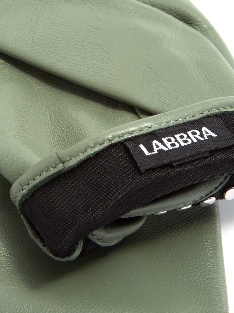 Перчатки торговой марки LABBRA производства Китай, изготовленные из натуральной кожи ягненка. Подкладка: искусственный шелк. Отделка - ремешок украшен металлической фурнитурой. Длина манжеты от нижней точки большого пальца до края перчаток - 2.5 см. Длина пальцев - средняя.