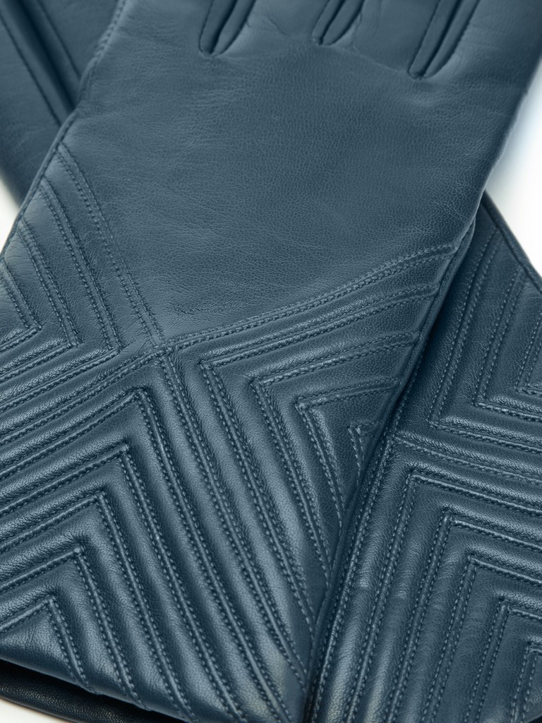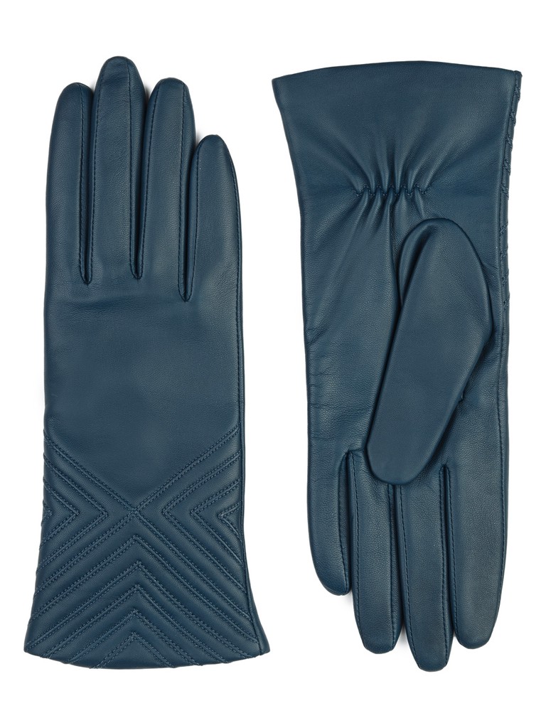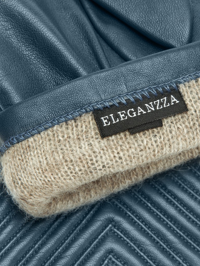 Перчатки женские торговой марки ELEGANZZA производства Китай. Выполнены из натуральной кожи ягненка. Подкладка - 100% шерсть. Отделка - геометрические декоративные строчки по лицевой части перчатки. Длина манжеты от нижней точки большого пальца до края перчаток - 6 см. Длина пальцев - средняя.