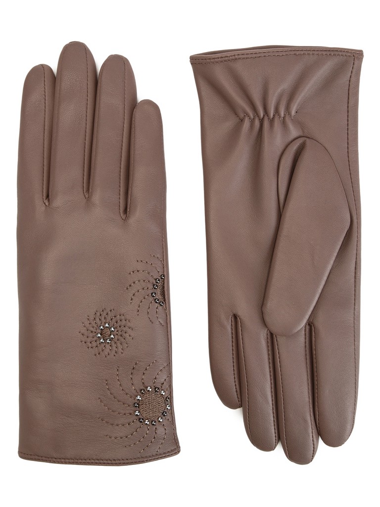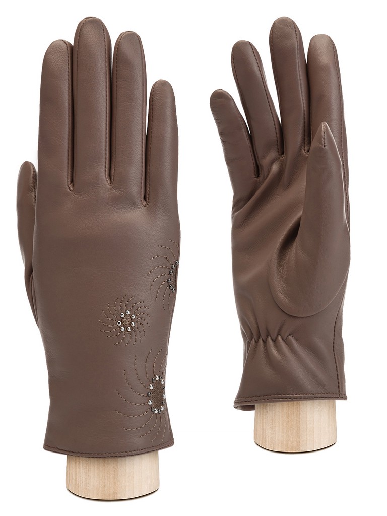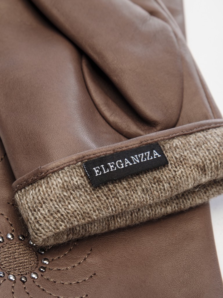Перчатки женские торговой марки ELEGANZZA производства Китай изготовлены из натуральной кожи ягненка. Подкладка: 70% шерсти, 30% кашемира. Отделка - декоративные цветочные строчки по лицевой части перчатки, украшенные маленькими хольнитенами цвета светлое золото и никель. Длина манжеты от нижней точки большого пальца до края перчаток - 5 см. Длина пальцев - средняя.