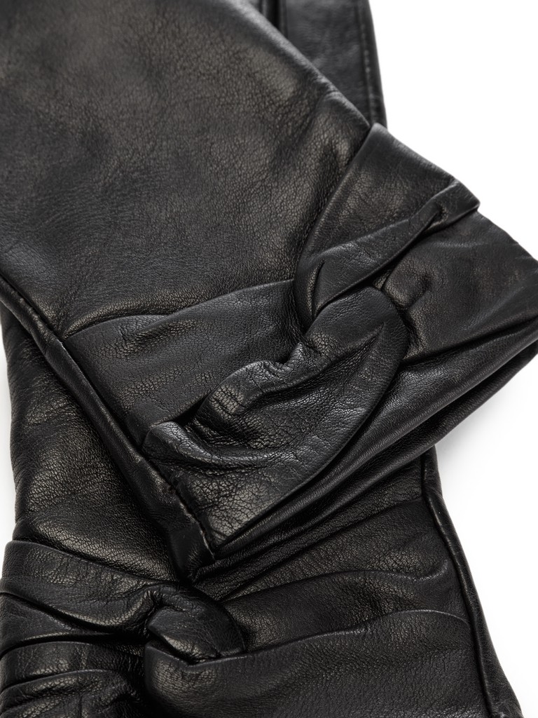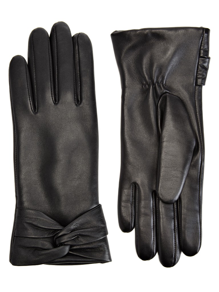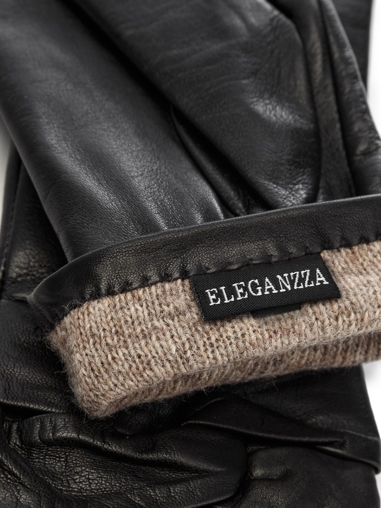 Перчатки торговой марки ELEGANZZA производства Китай выполнены из кожи ягнёнка. Подкладка: 100% шерсть. Отделка - декоративный бант из кожи, который крепится в шов, имитирует браслет на запястье. Длина манжеты от нижней точки большого пальца до края перчаток - 6,5 см. Длина пальцев - средняя.