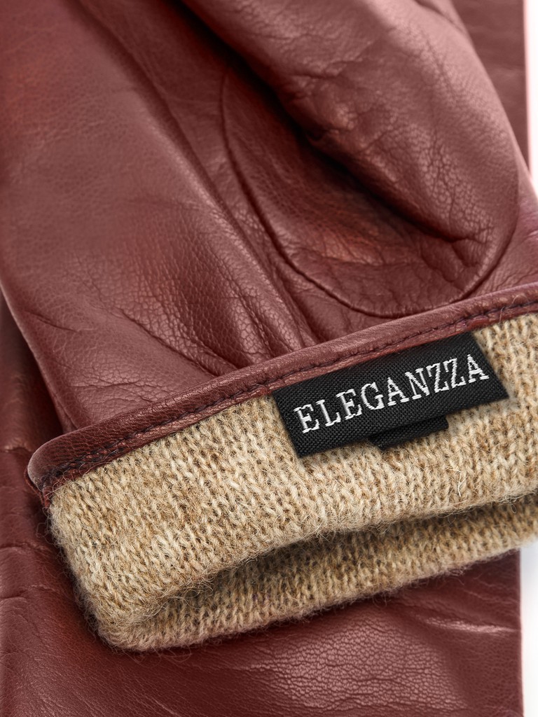 Перчатки женские торговой марки ELEGANZZA из натуральной кожи ягненка производства Италии. Подкладка: 100% шерсть. В углу перчатки со стороны мизинца фирменный "штамп" ELEGANZZA. Длина манжеты от нижней точки большого пальца до края перчаток составляет - 5,5 см. Длина пальцев - средняя.