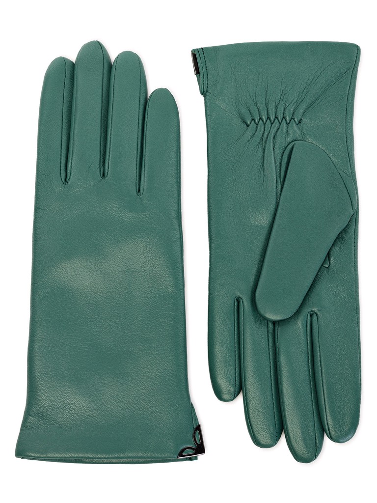 Перчатки женские торговой марки ELEGANZZA производства Китай. Выполнены из натуральной кожи ягненка. Подкладка - 100% шерсть. Отделка - декоративный боковой разрез, украшенный фурнитурой. Длина манжеты от нижней точки большого пальца до края перчаток - 5.5 см. Длина пальцев - средняя.