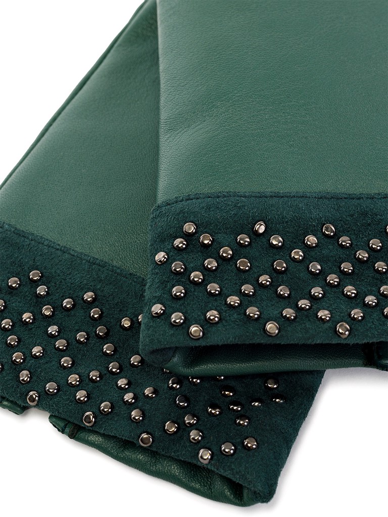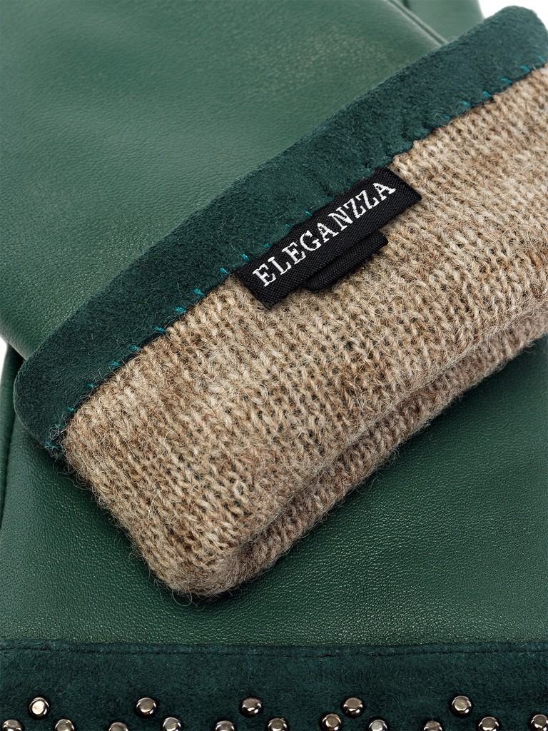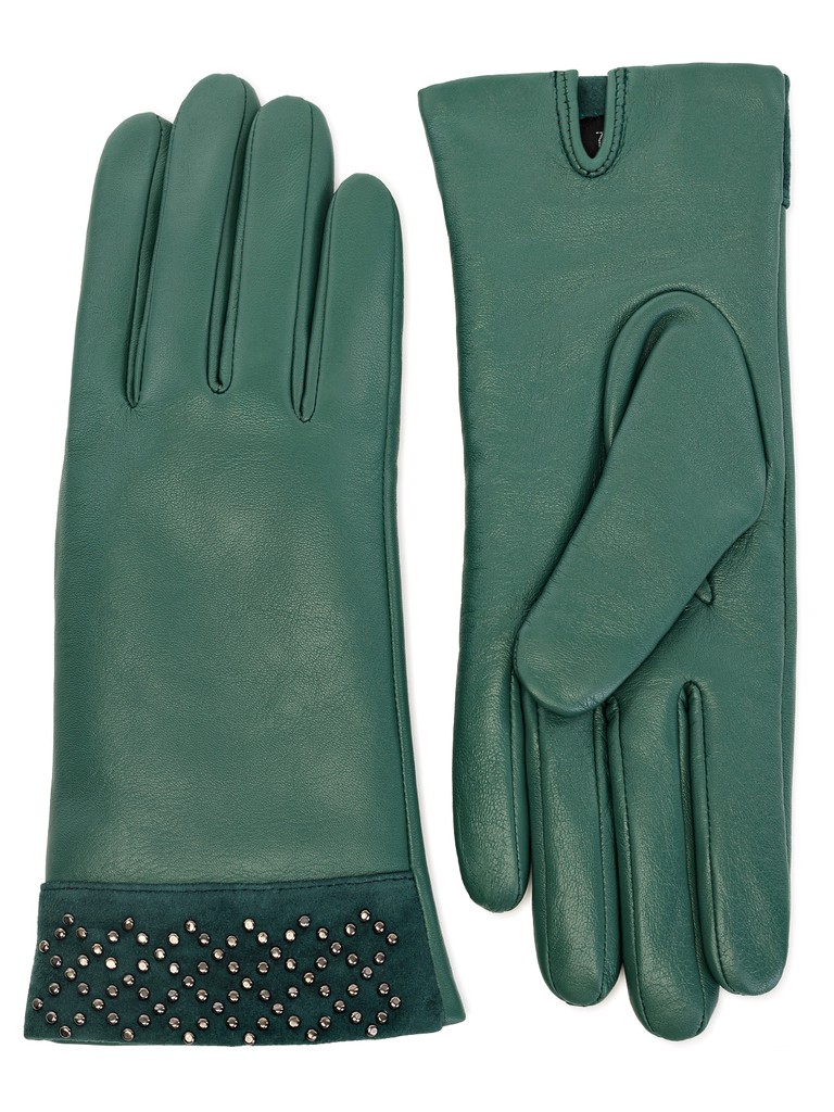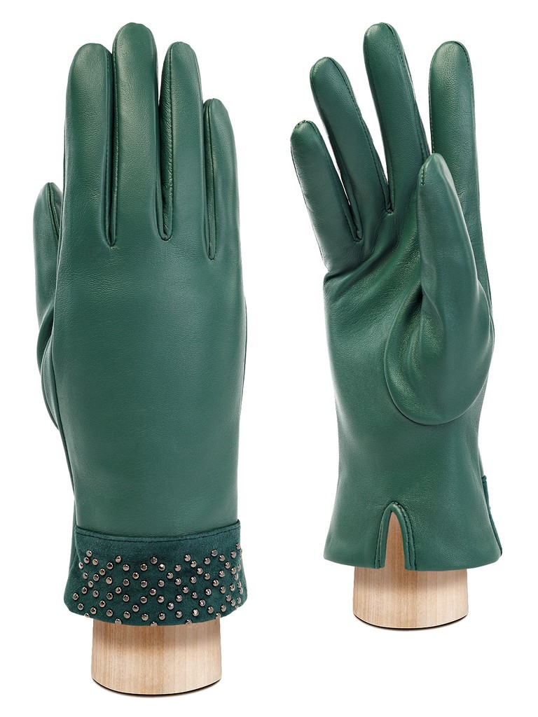 Перчатки женские торговой марки ELEGANZZA из натуральной кожи ягненка. Производство Китай. Подкладка: 100% шерсть. Отделка - манжет из натурального велюра в тон, украшенного раскладкой из хольнитенов с имитацией браслета. Разрез на ладонной части. Длина манжеты от нижней точки большого пальца до края перчаток - 6 см. Длина пальцев - средняя.