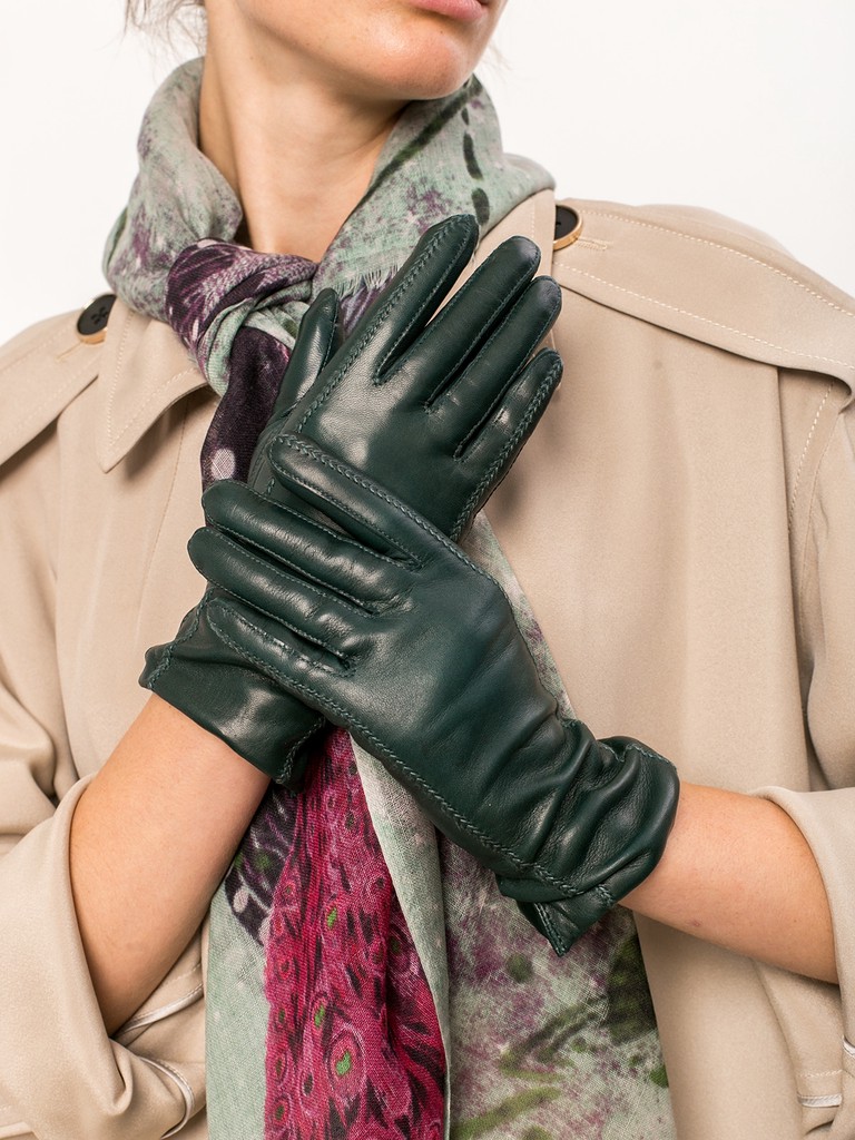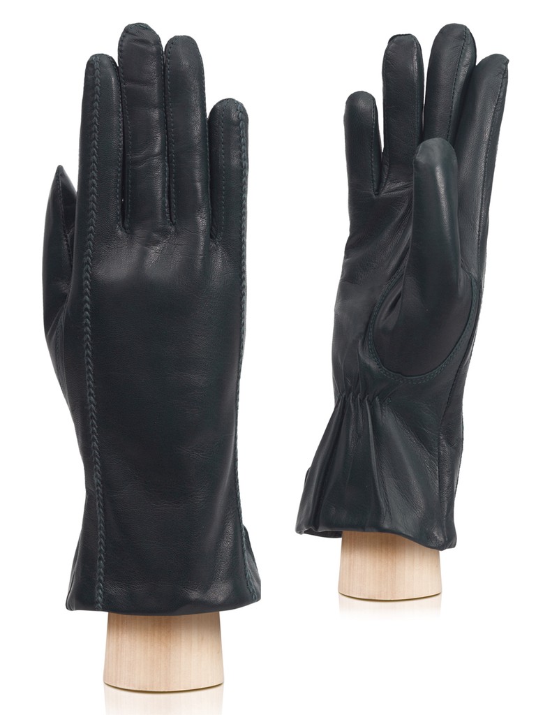 Перчатки женские торговой марки ELEGANZZA из натуральной кожи ягненка производства Италии. Подкладка: 85% шерсти, 15% кашемира. Декоративные швы на лицевой стороне; разрез сбоку, который упрощает вход. Длина манжеты от нижней точки большого пальца до края перчаток составляет - 8 см. Пальцы укороченные.