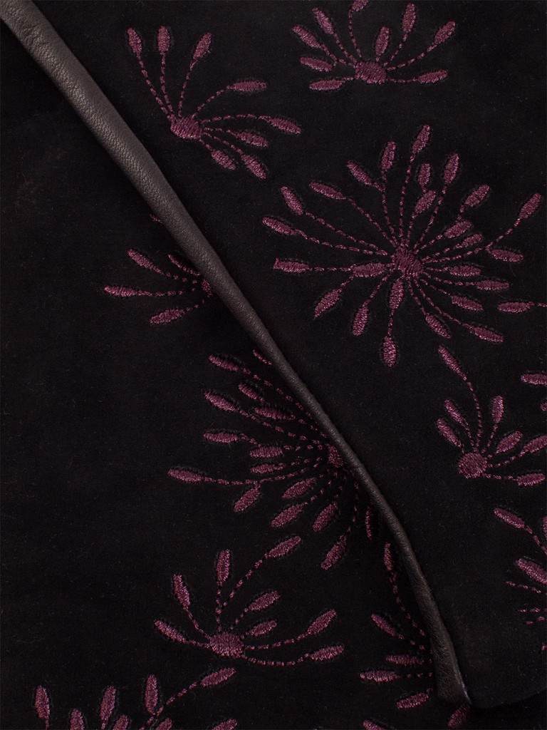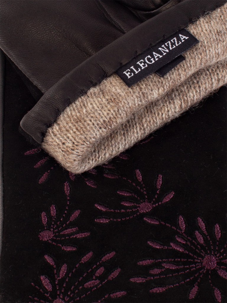 Перчатки женские торговой марки ELEGANZZA из натуральной итальянской кожи ягненка и натурального велюра на лицевой части.  Подкладка: 85% шерсть + 15% кашемир. Отделка - декоративная  вышивка в цветочной тематике. Длина манжеты от нижней точки большого пальца до края перчаток - 6,5 см. Длина пальцев - средняя.