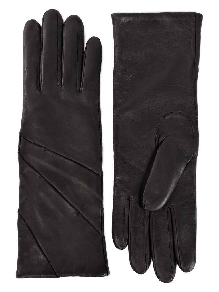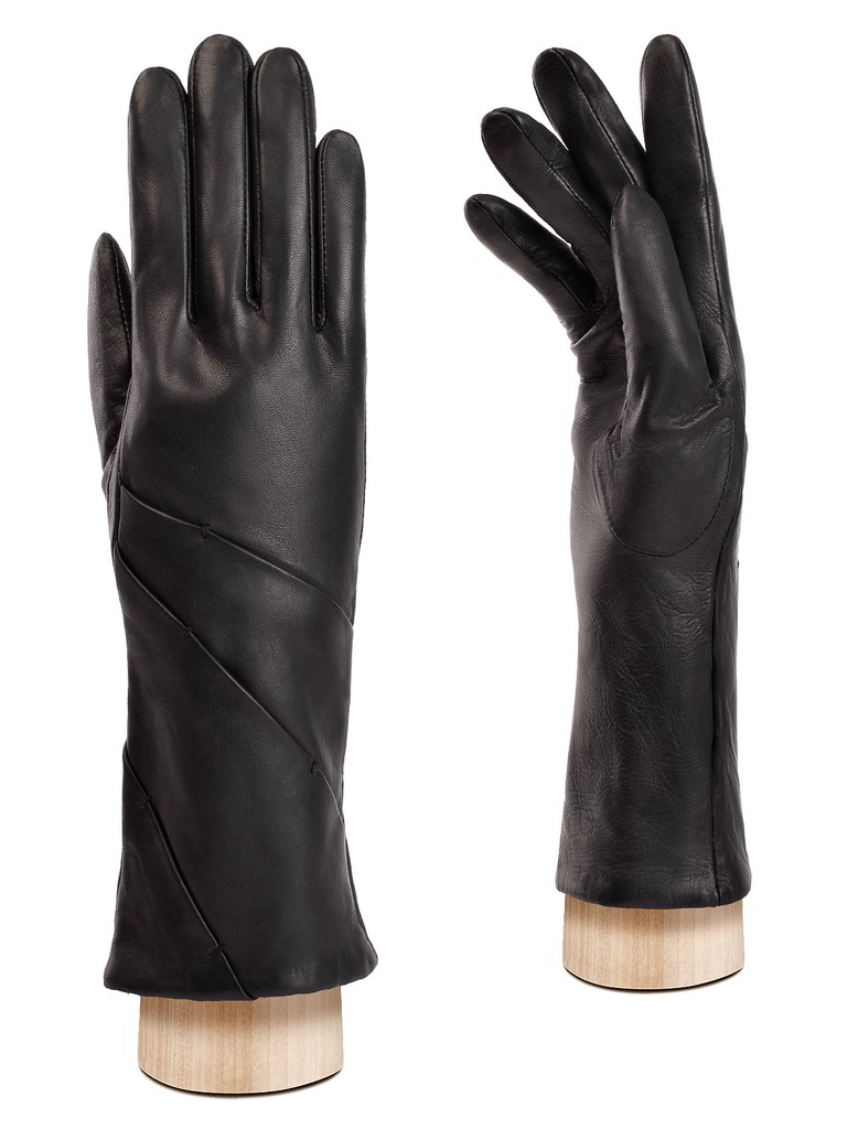 Перчатки женские торговой марки ELEGANZZA из натуральной итальнской кожи ягненка. Подкладка: 85% шерсть + 15% кашемир. Отделка - декоративные складки по диагонали на лицевой стороне, украшенные стежками ручной работы, гарантирующими дополнительную фиксацию конструкции. Длина манжеты от нижней точки большого пальца до края перчаток - 11,5 см. Длина пальцев - средняя.