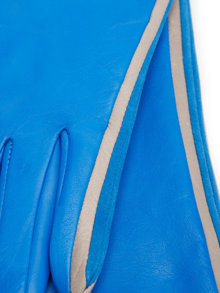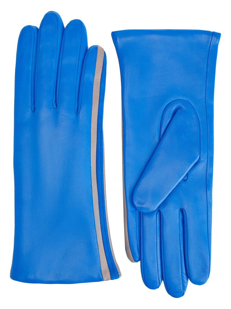 Перчатки женские торговой марки ELEGANZZA из натуральной кожи ягненка производство Италии. Подкладка: 85% шерсть, 15% кашемир. Отделка - контрастные вставки вдоль линии мизинца из натурального велюра и кожи. Длина манжеты от нижней точки большого пальца до края перчаток составляет - 6 см. Длина пальцев - средняя.