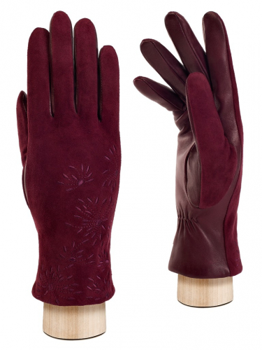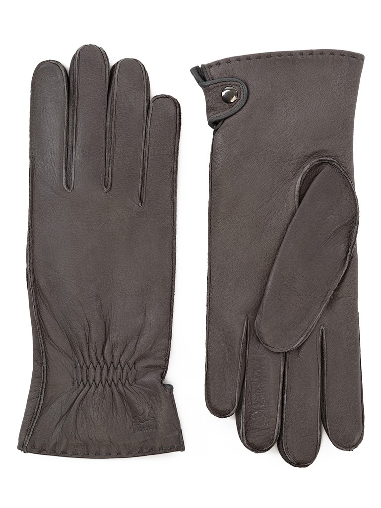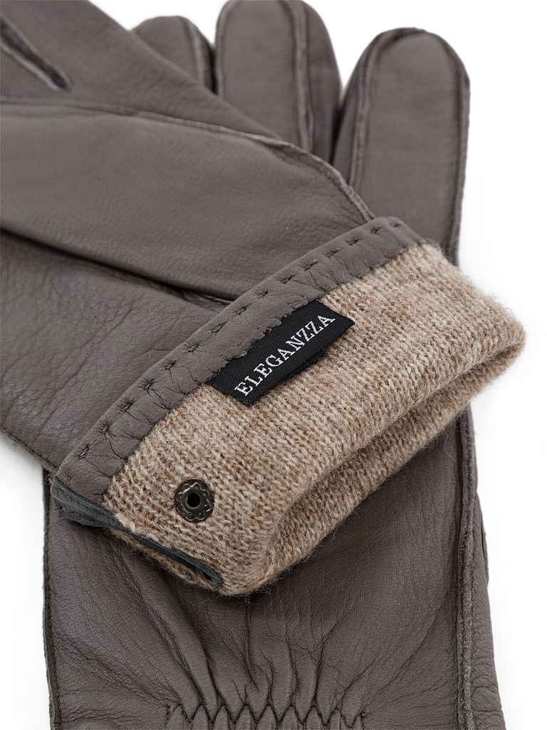 Перчатки торговой марки ELEGANZZA производства Китай выполнены из кожи оленя серого цвета. Подкладка 100% шерсть. Отделка: резинка на лицевой части обеспечивает плотную посадку на кисти; декоративный ремень по боковому разрезу на кнопке серебряного цвета; ручные стежки вдоль линии манжеты. Модель с наружними машинными швами.  Длина манжеты от нижней точки большого пальца до края перчаток - 5 см. Длина пальцев - средние.