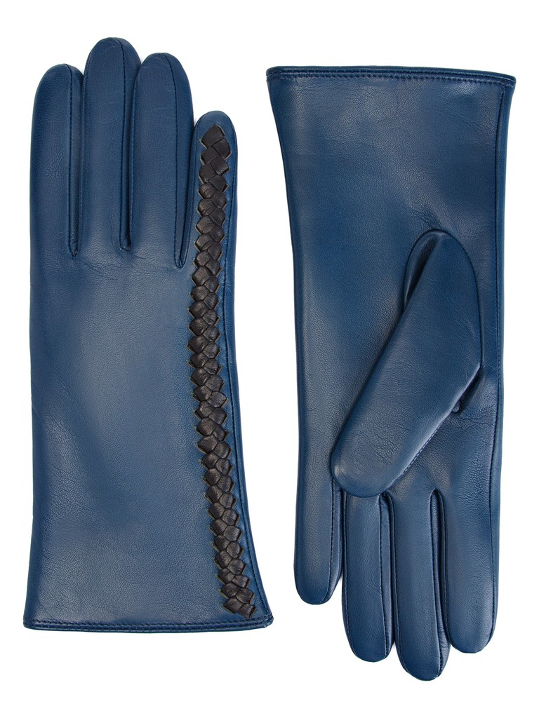 Перчатки торговой марки ELEGANZZA выполнены из кожи ягнёнка производства Италии. Подкладка: 85%шерсть,15%кашемир. Отделка - декоративная продежка тонким кожаным шнурком в форме косички вдоль мизинца, впыолняется в ручную. Длина манжеты от нижней точки большого пальца до края перчаток - 6,5 см. Длина пальцев - средняя.