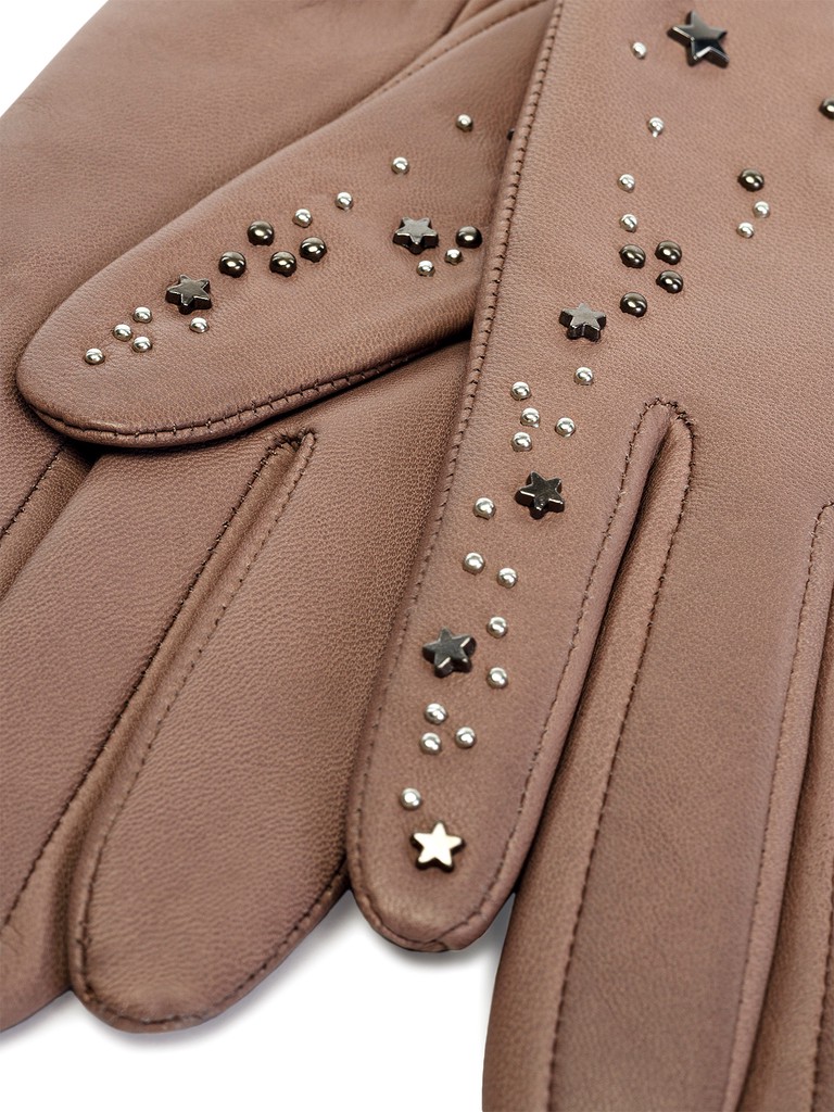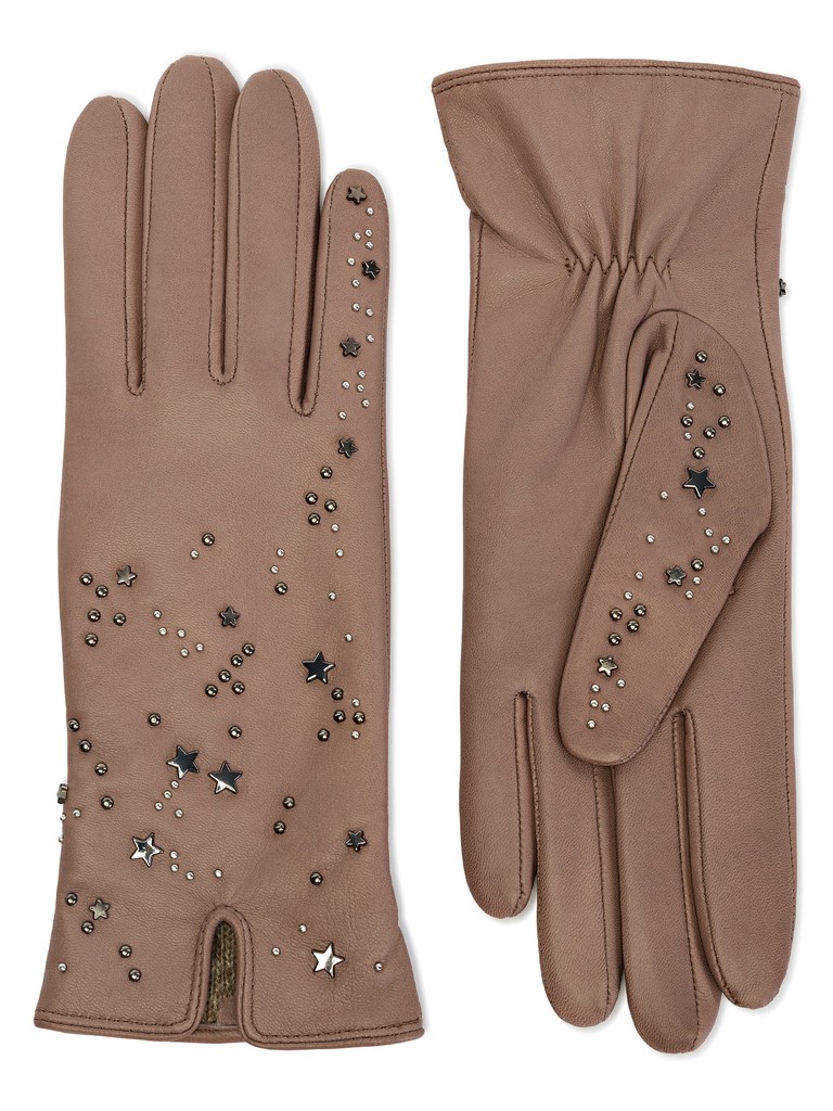 Перчатки торговой марки ELEGANZZA выполнены из натуральной кожи ягненка производства Италии. Подкладка: 85% шерсть, 15% кашемир. Отделка - лицевая часть перчатки украшена россыпью хольнитенов, имитирующих звездное небо. Длина манжеты от нижней точки большого пальца до края перчаток - 6 см. Длина пальцев - средняя.