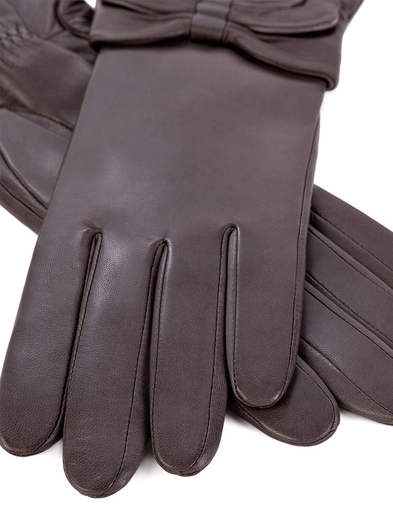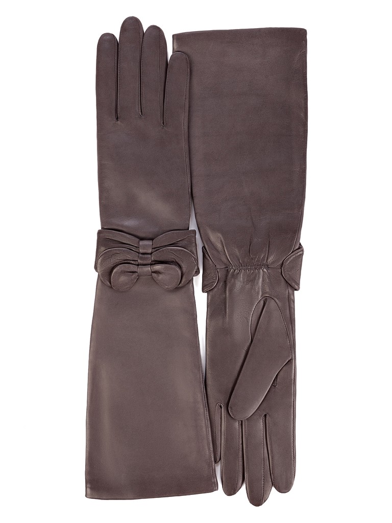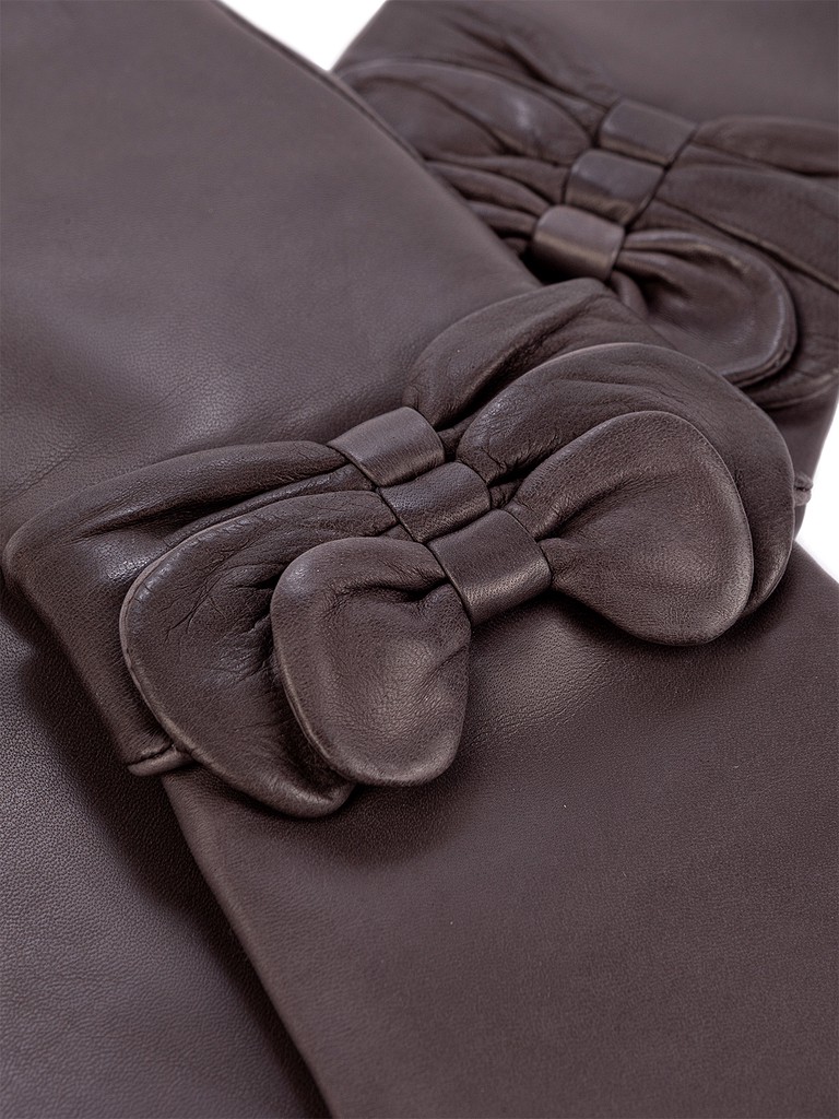 Перчатки торговой марки ELEGANZZA производства Филиппины, выполнены из кожи ягнёнка черного цвета. Подкладка - 50% шерсть + 50% кашемир. Отделка - два декоративных кожаных бантика. Длина манжеты от нижней точки большого пальца до края перчаток - 25 см. Длина пальцев - средние.