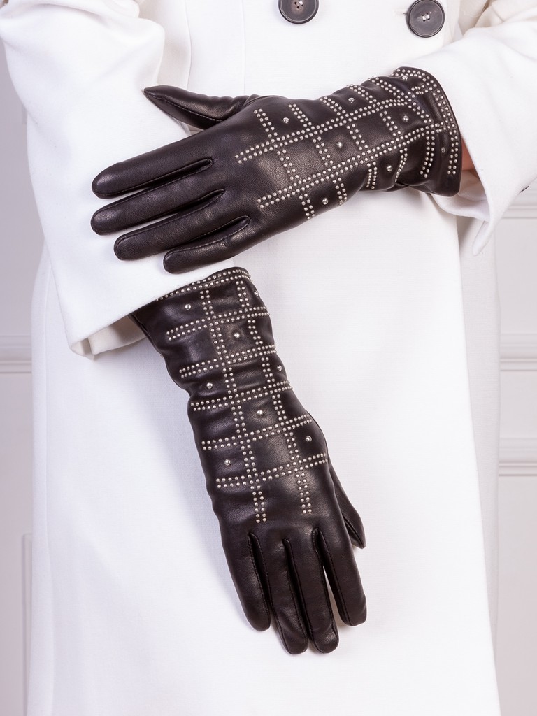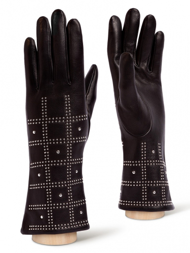 Перчатки торговой марки ELEGANZZA производства Италия выполнены из натуральной кожи ягненка. Подкладка: 85% шерсть, 15% кашемир. Отличительная особенность перчатки - выполнена из одного куска кожи, без шва по указательному пальцу. Отделка - геометрический орнамент, выполненный из металлических хольнитенов. Длина манжеты от нижней точки большого пальца до края перчаток - 9,5 см. Длина пальцев - средняя.