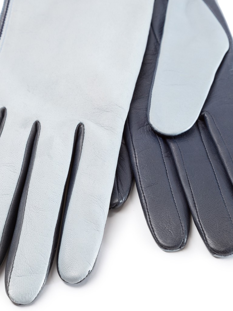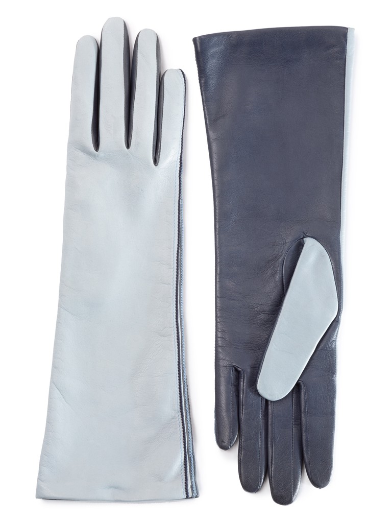 Перчатки торговой марки ELEGANZZA производства Филиппины, изготовленные из натуральной кожи ягненка. Двухцветная перчатка украшена контрастными отстрочками по всей длине вдоль мизинца. Подкладка: натуральный шелк. Длина манжеты от нижней точки большого пальца до края перчаток - 14 см. Длина пальцев - средняя.