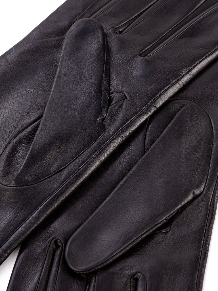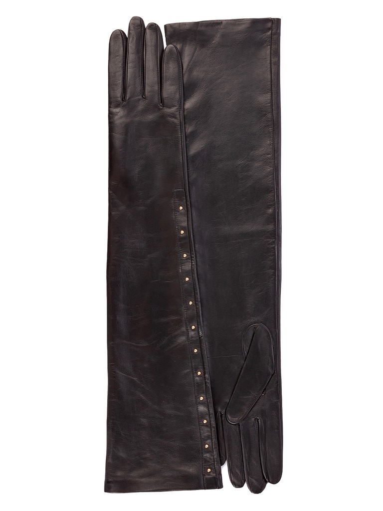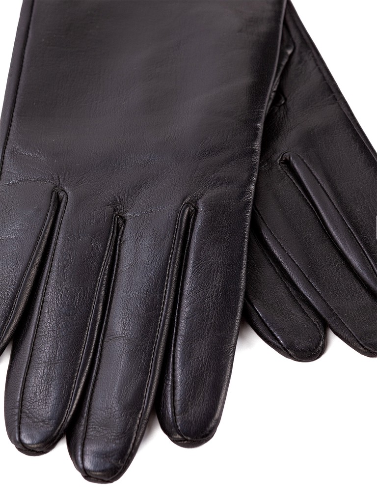 Перчатки торговой марки ELEGANZZA производства Филиппины. Изготовлены из натуральной кожи ягнёнка. Подкладка - натуральный шелк. Отделка - дополнительная тонкая полоска по всей длине перчатки по линии мизинца, украшенная миниматюрными хольнитенами. Длина манжеты от нижней точки большого пальца до края перчаток составляет - 35 см. Длина пальцев - средняя.
