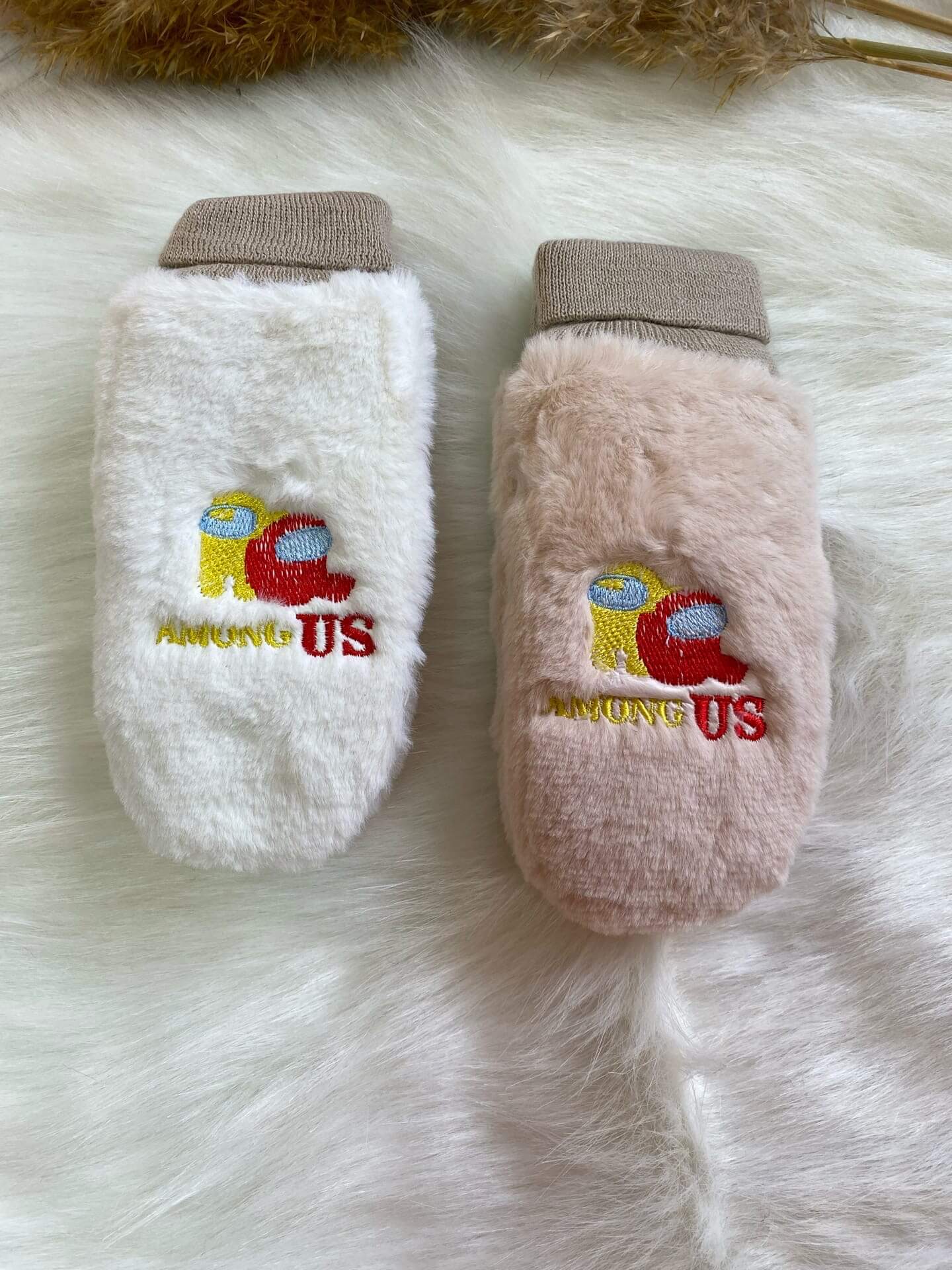 Варежки детские с принтом. Тыльная часть из эко замши, верхняя часть эко мех. Внутри теплый плюшевый мех.