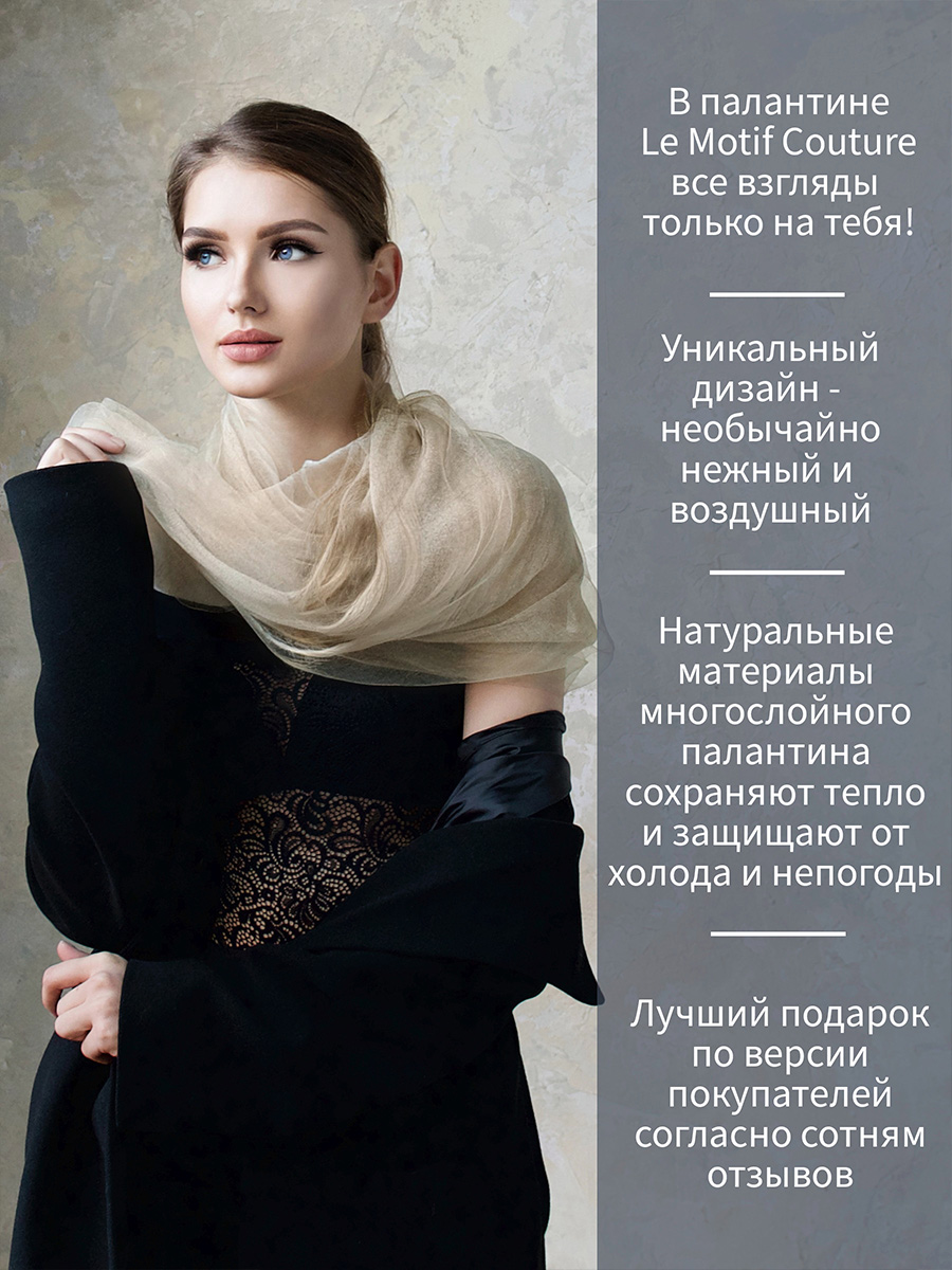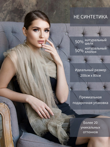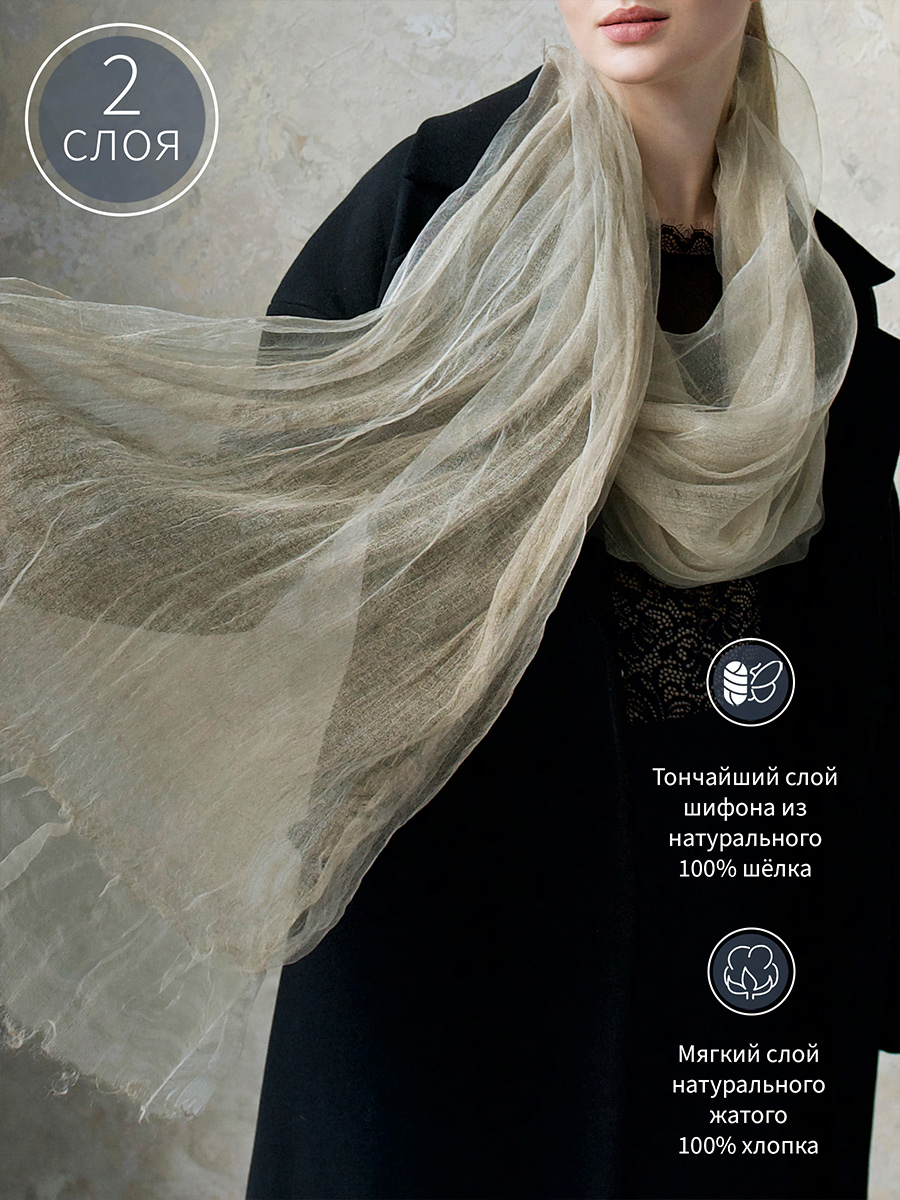 Уникальный своим дизайном двухслойный воздушный шарф не останется без внимания и удачно дополнит как элегантный вечерний образ, так и легкий стильный дневной наряд. Палантин выполнен из тончайшего, нежного шелка и хлопка с использованием исключительной технологии обработки материала, что позволяет на себе ощутить необычайную мягкость и невесомость этих натуральных тканей. Удачная комбинация материалов и специальная окраска волокон позволили и сохранить естественный блеск шёлка, и задать глубокую, но мягкую цветовую гамму хлопку.