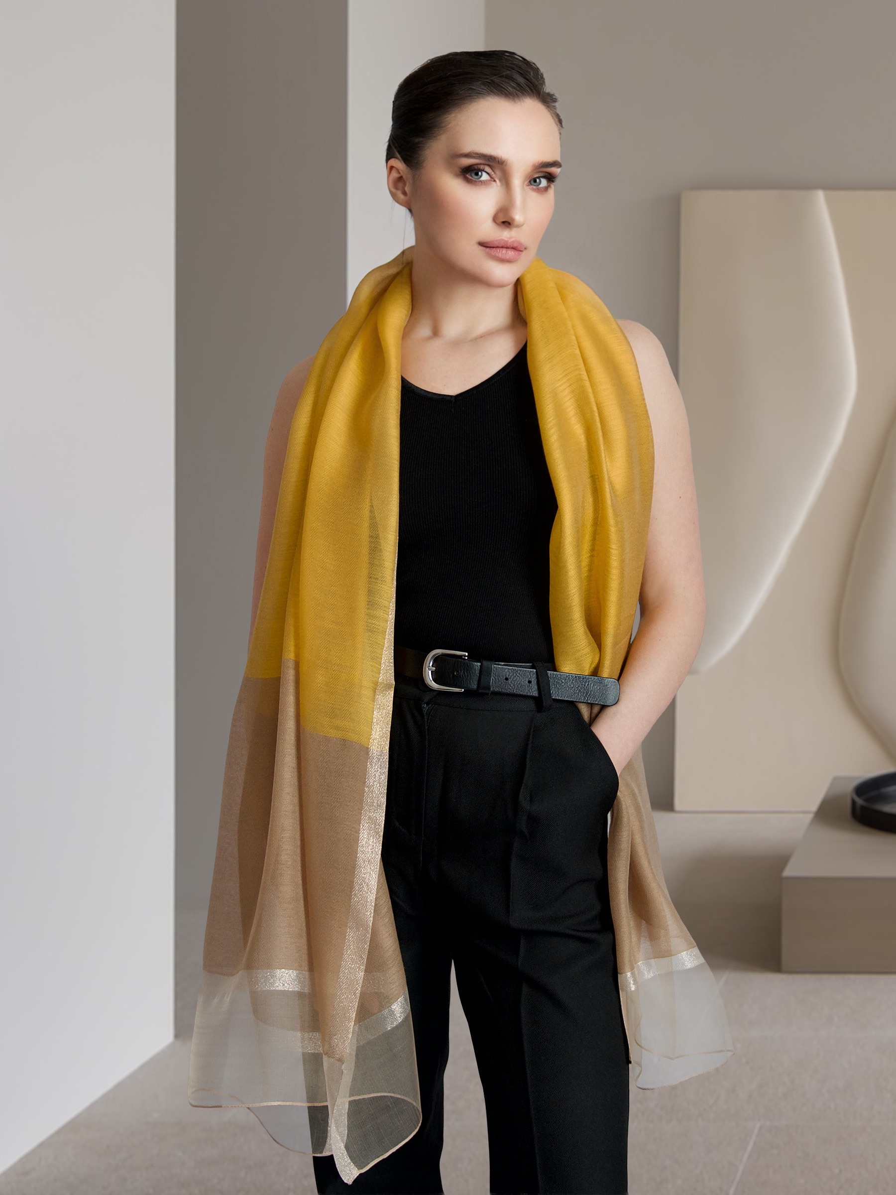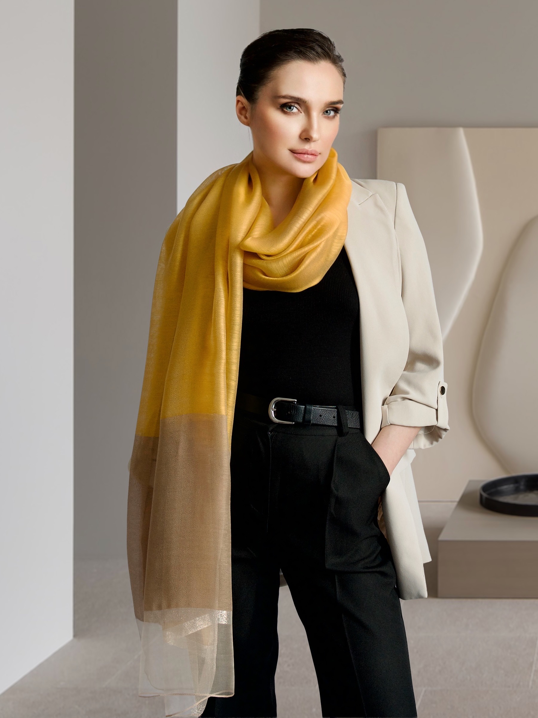 Уникальный своим дизайном воздушный палантин не останется без внимания и удачно дополнит как элегантный вечерний образ, так и стильный дневной наряд. Палантин выполнен из нежного шёлка и мягкой шерсти, с декоративной отделкой из мягкой золотой нити. Удачная комбинация материалов и специальная окраска волокон позволили сохранить естественный блеск шёлка и задать глубокую, но мягкую цветовую гамму шерсти. Такой аксессуар подчеркнет вашу индивидуальность и выделит среди остальных.