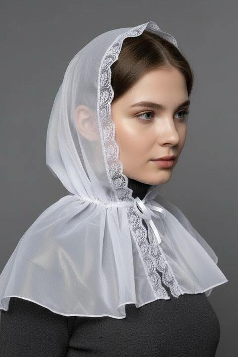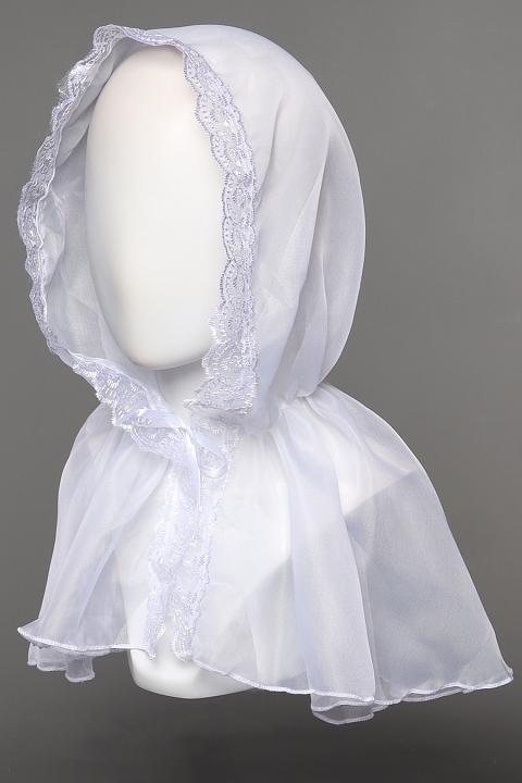 Накидка-капюшон выполнена из мягкого воздушного шифона, по краю окантована кружевной лентой.
