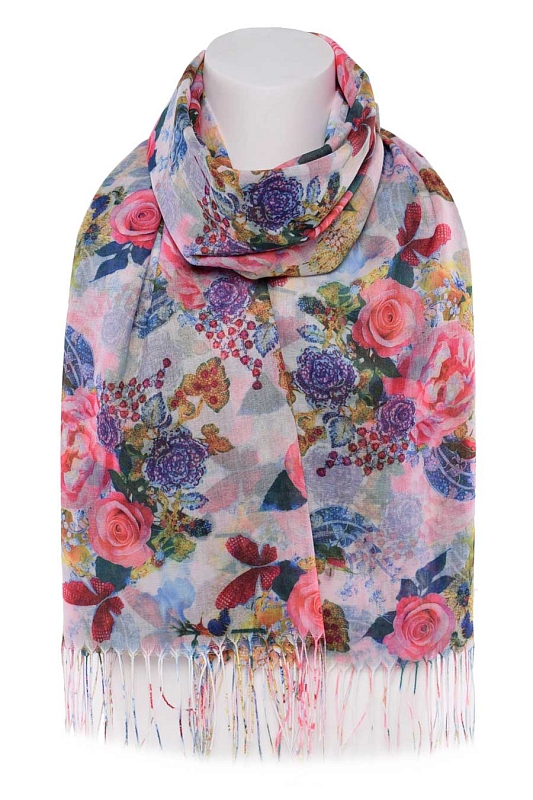 Легкий, мягкий палантин с цветочным принтом. Края палантина заканчиваются кромкой, концы палантина - бахрома.