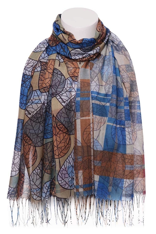Палантин мягкий, тонкий. Одна сторона - рисунок, другая сторона - клетка. Края палантина заканчиваются кромкой, концы - бахрома.