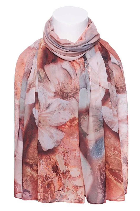 Тонкий палантин из шёлк - шифона с цветочным фотопринтом. Полупрозрачная ткань, более плотная, чем классический шифон, с характерной структурой. Края палантина заканчиваются швом в подрубку.