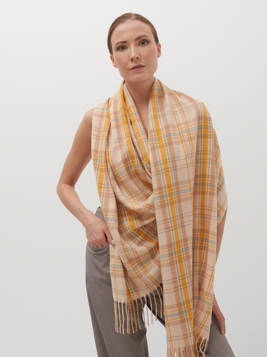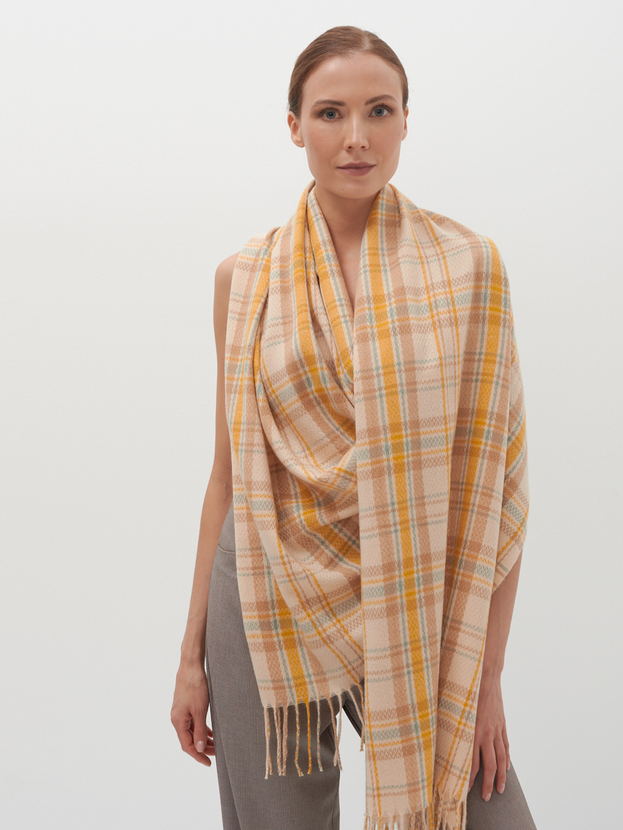 Большой, мягкий, теплый двусторонний палантин с рисунком в стиле арт-деко. Края изделия украшены кистями. Только ручная стирка. Шерсть 25%, вискоза 30%, модал 45%