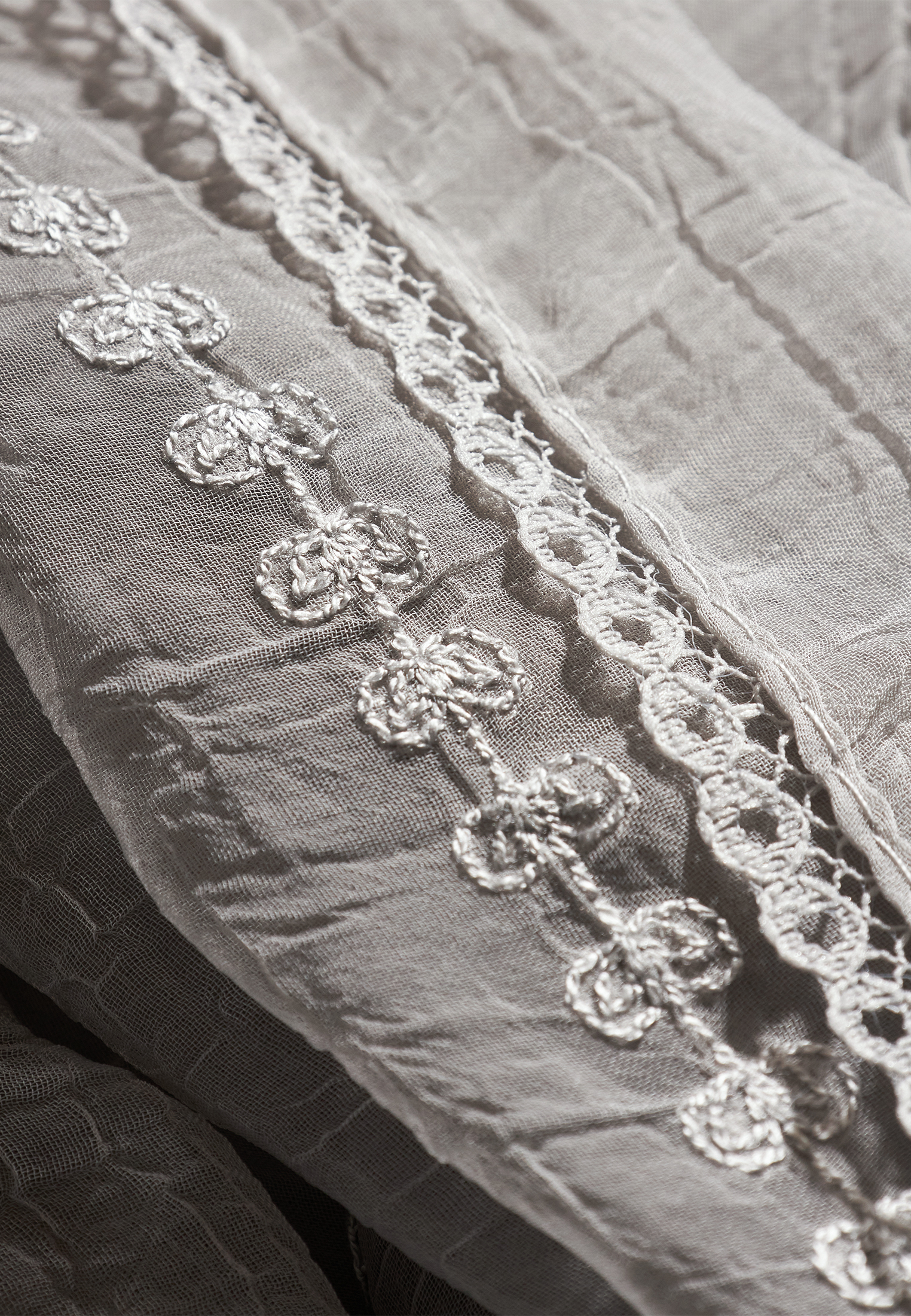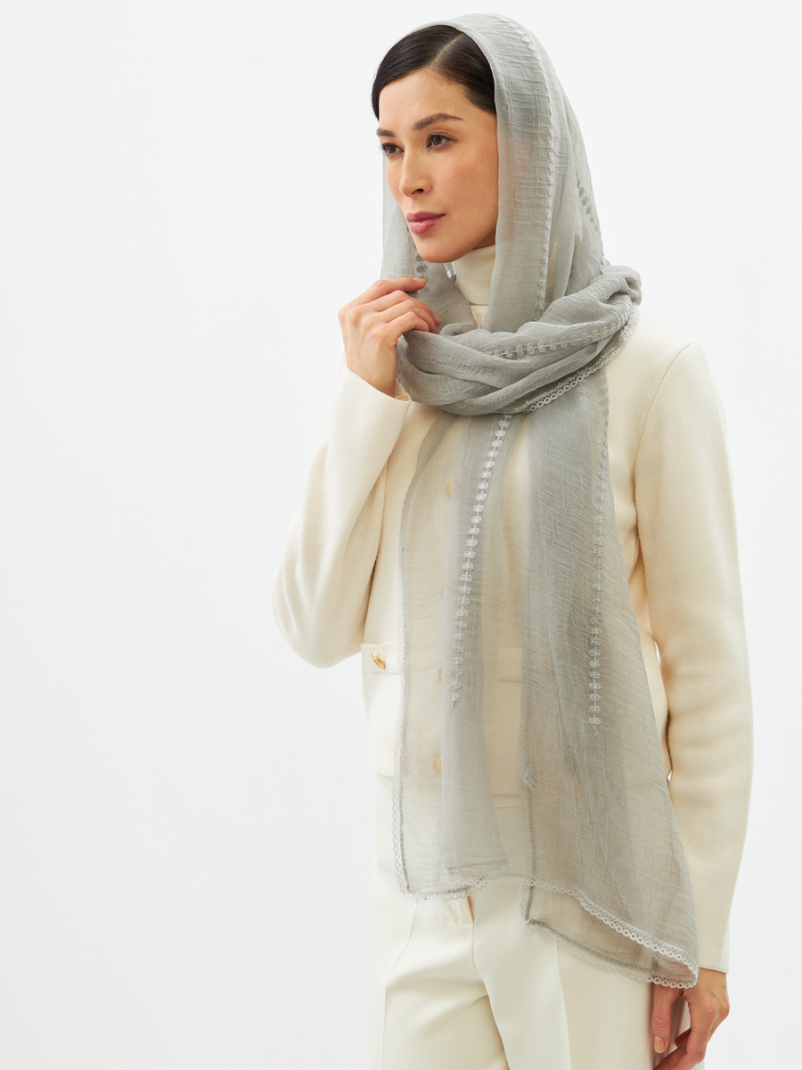 Создан из невесомого жатого шифона. Его двусторонний дизайн и вышивка в стиле "арт-деко" придают аксессуару уникальность и соответствие модным тенденциям. Аккуратно обработанные края подчеркивают наше мастерство.