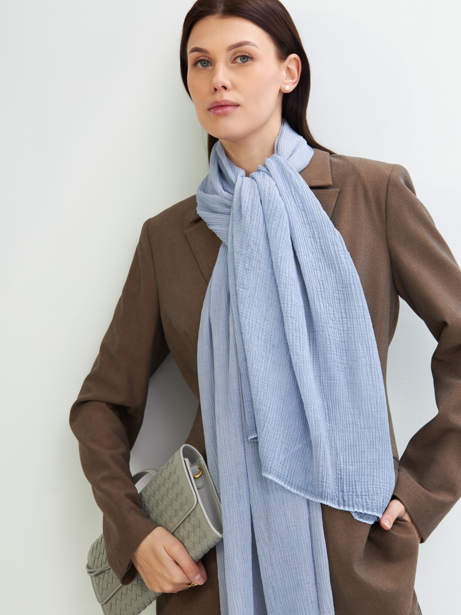 Представляем вашему вниманию элегантный двусторонний палантин DRK-1455-10, который станет жемчужиной ассортимента вашего бутика или шоурума. Это не просто аксессуар, а универсальное решение для создания стильных и завершенных образов, востребованное вашей целевой аудиторией.Созданный из тонкого жатого шифона премиального качества, наш палантин обладает уникальной текстурой и приятной легкостью. Его двусторонний дизайн предлагает еще больше возможностей для стилизации, позволяя легко менять акценты в зависимости от наряда, что повышает его ценность для конечного покупателя.Преимущества для вашего бизнеса:Высокий спрос: Палантины — всегда востребованный аксессуар, идеально подходящий для межсезонья и летних вечеров, обеспечивающий стабильные продажи.Широкий круг покупателей: Элегантный дизайн и универсальный светло-голубой оттенок (как на фото) привлекают женщин разного возраста и стиля, расширяя вашу клиентскую базу.Превосходное качество: Как российский производитель полного цикла, TANTINO гарантирует безупречность каждого шва и точность обработки краев. Мы сами конструируем и шьем, контролируя каждый этап производства.Легкость в уходе: Возможность машинной деликатной стирки делает этот палантин практичным выбором для конечного потребителя, что является важным конкурентным преимуществом.Отличная маржинальность: Инвестируйте в продукцию, которая обеспечит стабильный доход и лояльность клиентов благодаря своему качеству, актуальности и идеальной посадке.Добавьте палантины DRK-1455-10 в свой ассортимент и предложите клиентам сочетание стиля, комфорта и практичности, произведенное с любовью и вниманием к деталям в России. Полиэстер 35%, Вискоза 30%, Модал 25%, Шелк 10%
