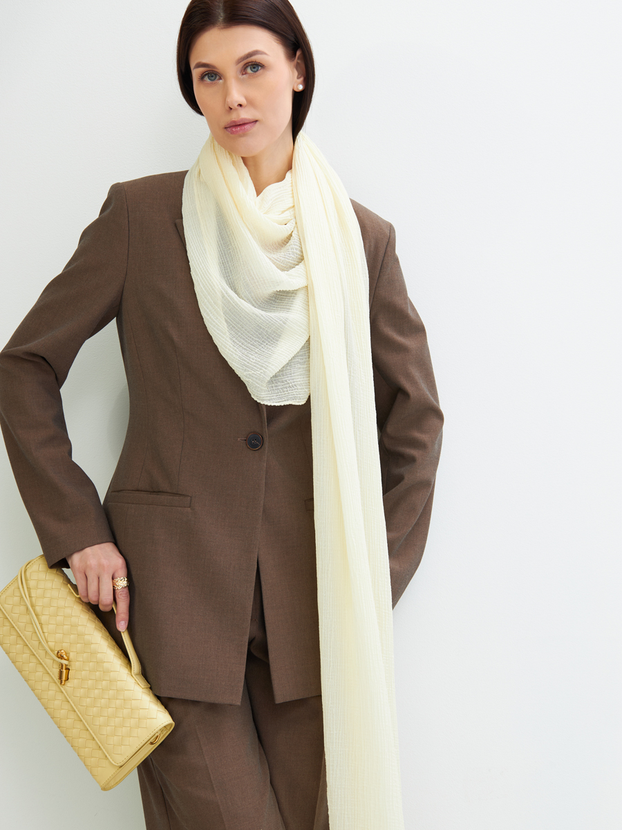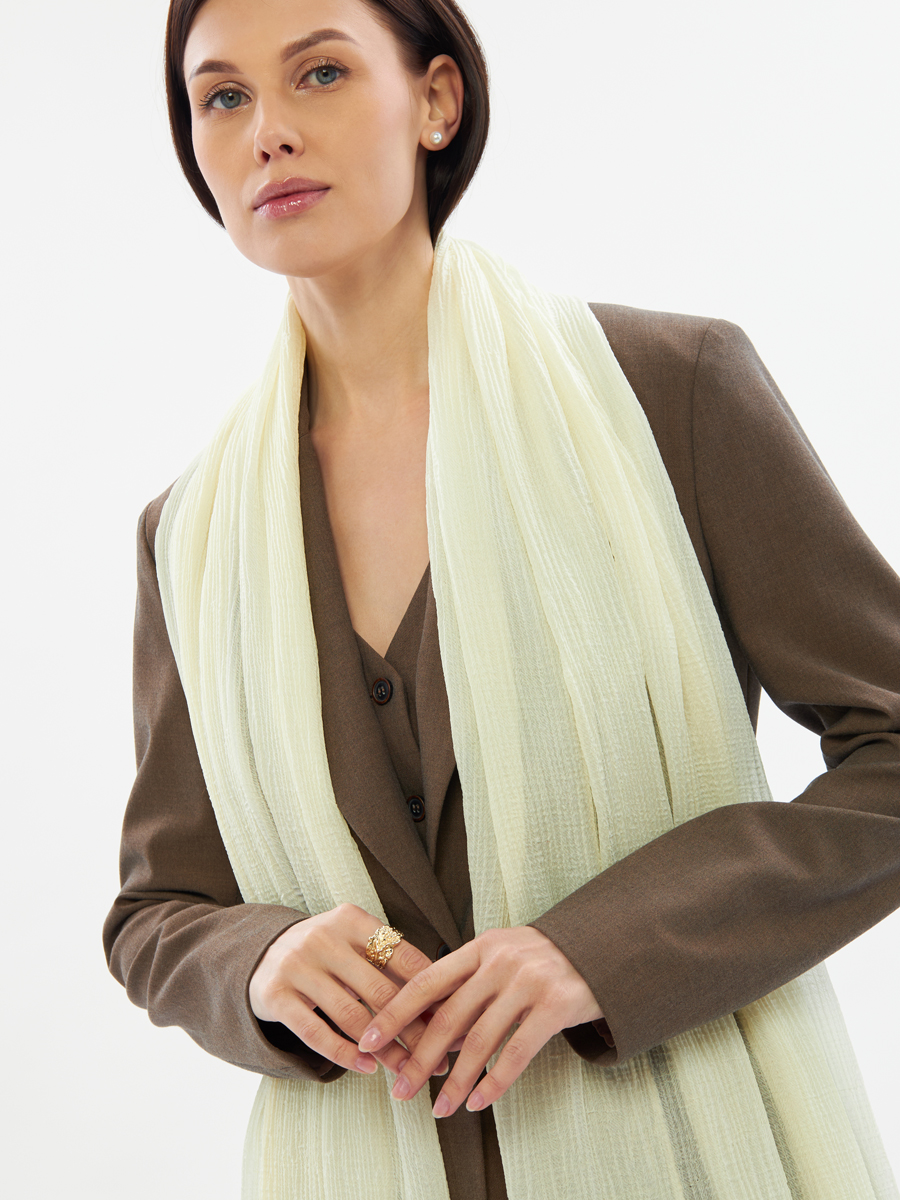 Представляем вашему вниманию изысканный женский палантин DRK-1455-69 — незаменимый элемент для расширения ассортимента вашего бутика или шоурума. Этот аксессуар, созданный на собственном производстве TANTINO, является воплощением элегантности и высокого качества, что гарантирует его популярность среди ваших покупательниц.Палантин выполнен из тонкого жатого шифона, что придает ему уникальную текстуру и легкую воздушность. Двусторонняя структура и универсальная цветовая гамма делают его невероятно практичным: его можно носить различными способами, добавляя изюминку как к повседневному, так и к вечернему образу. Аккуратная обработка краев свидетельствует о внимании к деталям и высоком стандарте пошива, характерном для всех изделий TANTINO.Преимущества для вашего бизнеса: Высокий спрос: Палантины всегда востребованы как стильный и функциональный аксессуар. Универсальность: Легко комбинируется с различными стилями одежды — от классических пальто до летних платьев. Отличное качество: Изделие собственного производства из качественных материалов, с гарантией долговечности. Простота ухода: Возможность машинной деликатной стирки делает уход за палантином максимально удобным для конечного потребителя. Привлекательная маржа: Прямые поставки от производителя позволяют предложить выгодные условия для оптовых закупок.Добавьте этот элегантный палантин в свою коллекцию, чтобы предложить клиентам не просто аксессуар, а возможность для трансформации образа и проявление индивидуальности. Сотрудничая с TANTINO, вы получаете надежного партнера и продукцию, которая удовлетворит самых требовательных модниц.