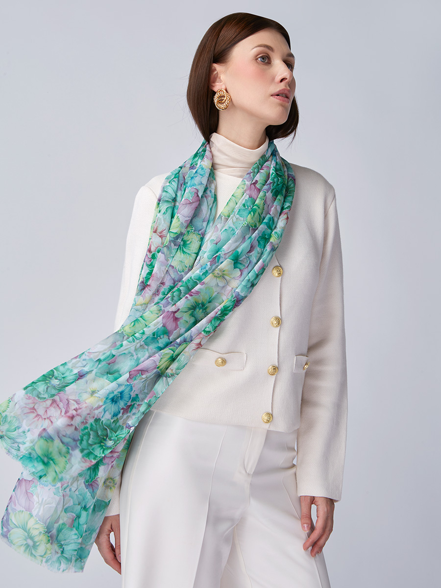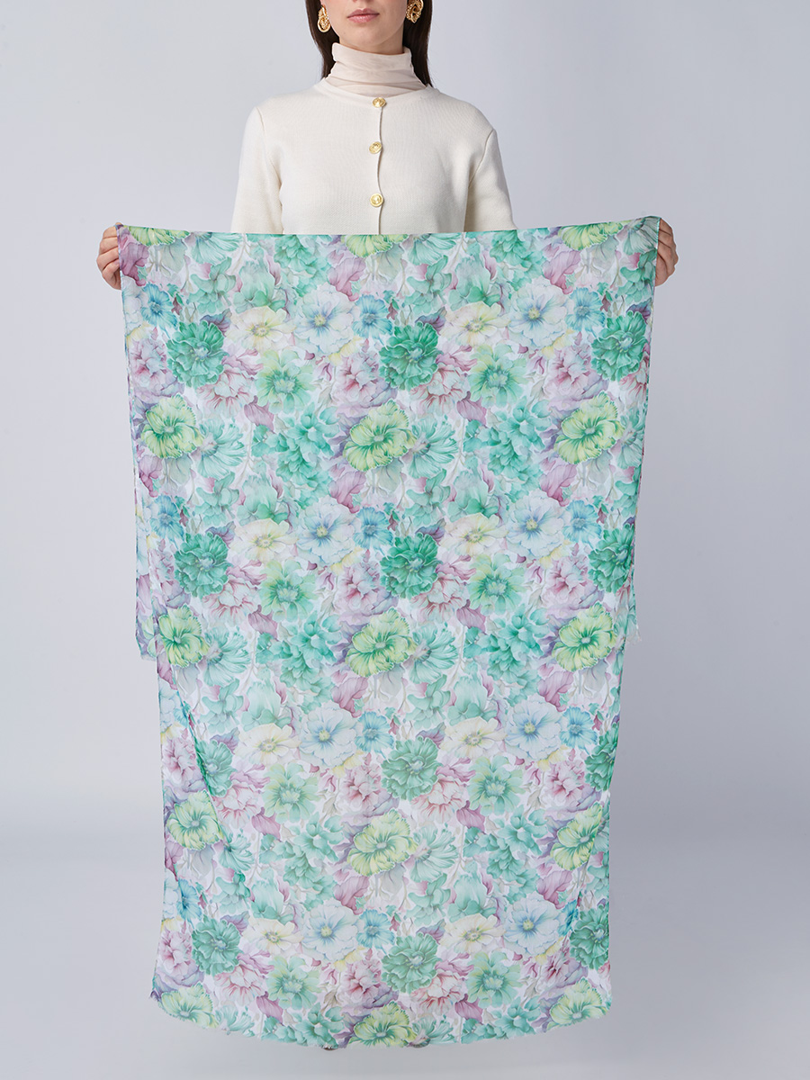 Большой, мягкий, тонкий и очень нежный палантин с рисунком. Только ручная стирка. 55% полиэстер, 35% вискоза, 10% шелк