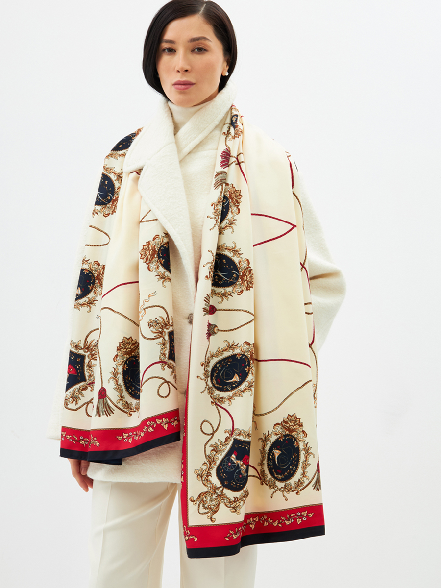Представляем уникальный двусторонний палантин LO-1115 – жемчужину вашей оптовой коллекции, способную мгновенно привлечь внимание самых взыскательных покупательниц, ценящих истинную элегантность и безупречное качество.Экспертный дизайн и превосходное качество:Роскошный принт в стиле «арт-деко» с медальонами, цепями и узорами на светлом фоне, обрамленный красно-черной каймой, придает изделию аристократичный шик и неповторимый характер.Двустороннее исполнение расширяет возможности стайлинга, позволяя создавать множество разнообразных образов для вашей клиентской базы.Атласная текстура ткани обеспечивает приятные тактильные ощущения и благородный блеск, подчеркивая глубину цветов и детализацию рисунка.Аккуратная обработка краев – это гарантия долговечности и сохранности первоначального вида, демонстрирующая высокий уровень нашего производства.Как российский производитель полного цикла, мы гарантируем стабильно высокое качество. Предлагая LO-1115, вы инвестируете в продукт с высоким потенциалом продаж и маржинальности, который усилит имидж вашего бутика как поставщика эксклюзивных аксессуаров.Уход: Для сохранения идеального вида рекомендуется деликатная машинная стирка. Полиэстер 60%, Вискоза 30%, Шелк 10%