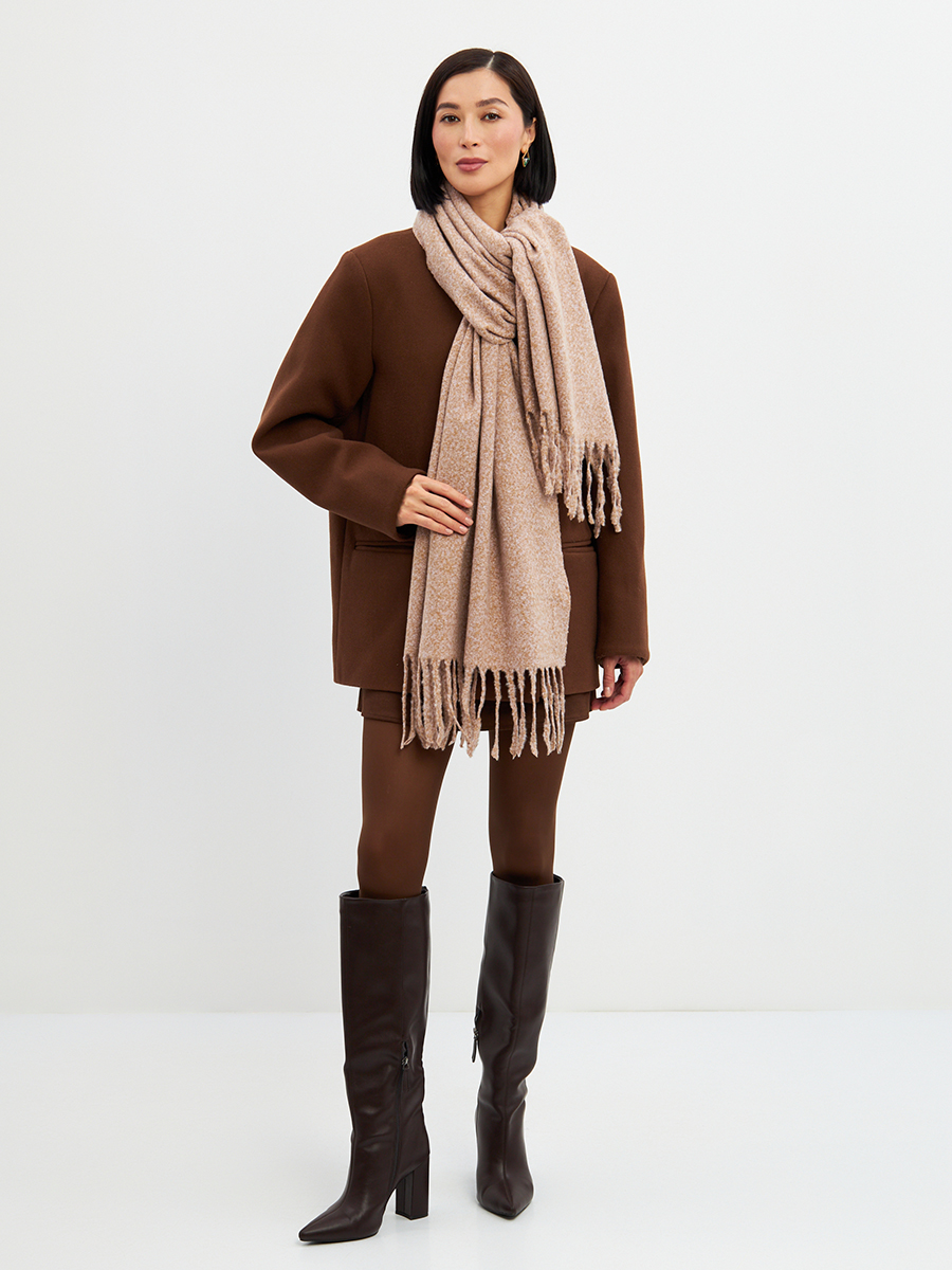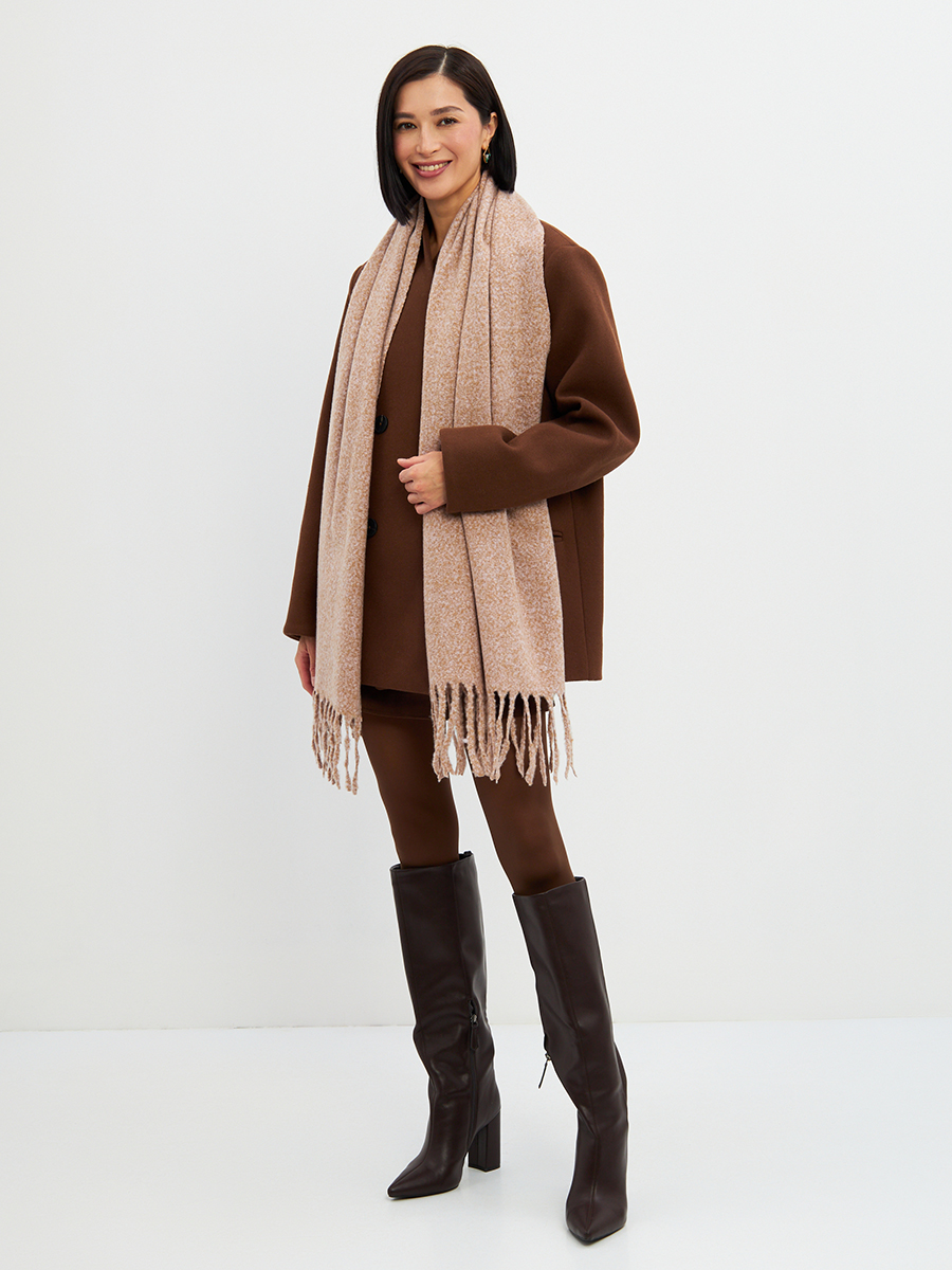 Большой, мягкий, теплый двусторонний однотонный меланжевый палантин. Края изделия украшены бахромой. Машинная деликатная стирка. Шерсть 10% Модал 55% Вискоза 35%
