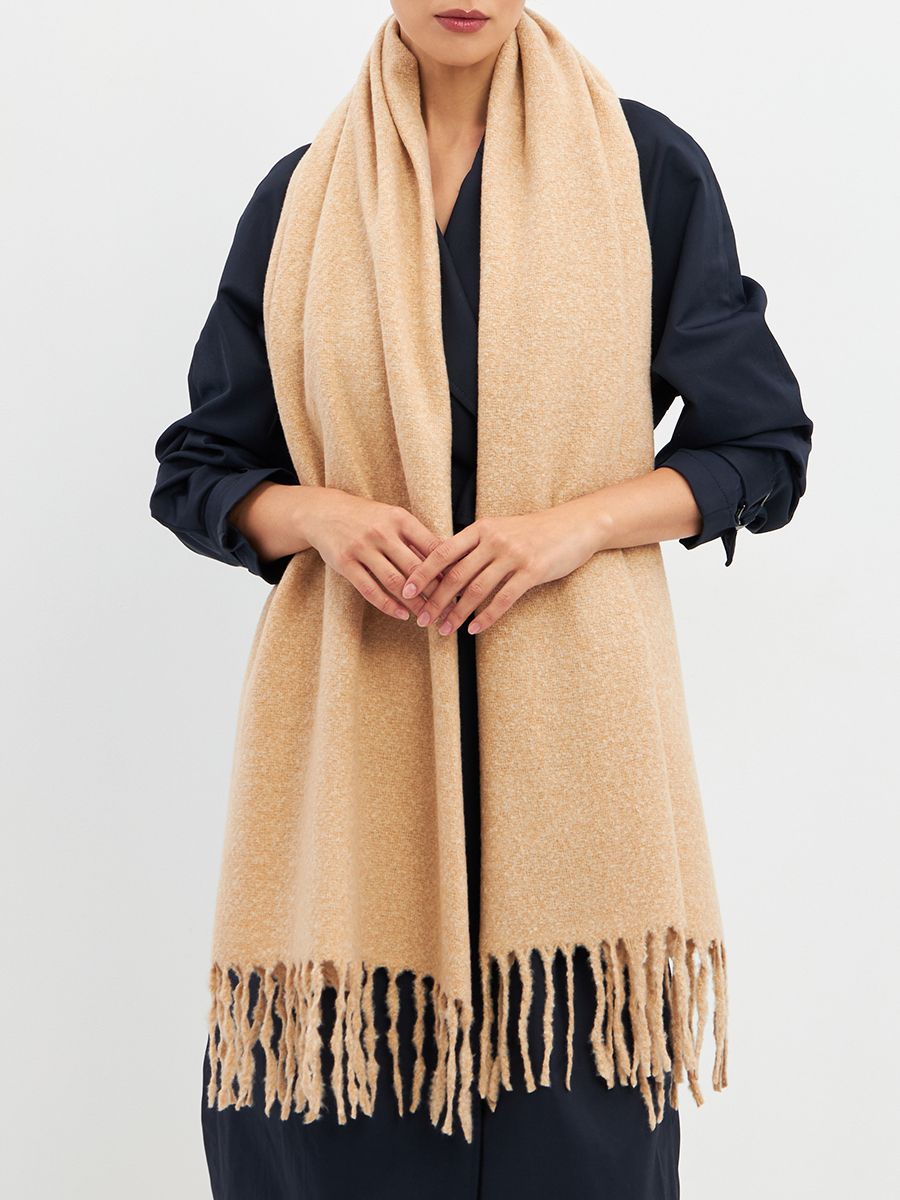 Большой, мягкий, теплый двусторонний однотонный палантин. Края изделия украшены бахромой. Машинная деликатная стирка. Шерсть 10% Модал 55% Вискоза 35%