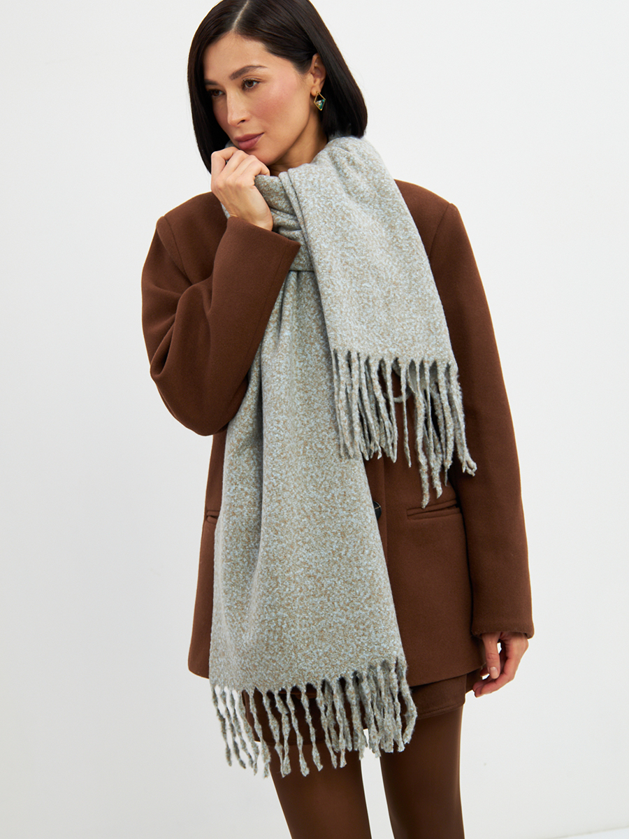 Большой, мягкий, теплый двусторонний однотонный меланжевый палантин. Края изделия украшены бахромой. Машинная деликатная стирка. Шерсть 10% Модал 55% Вискоза 35%