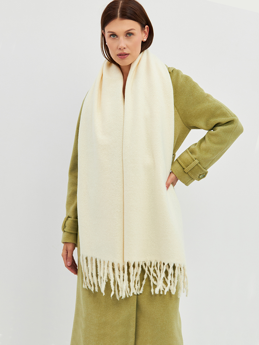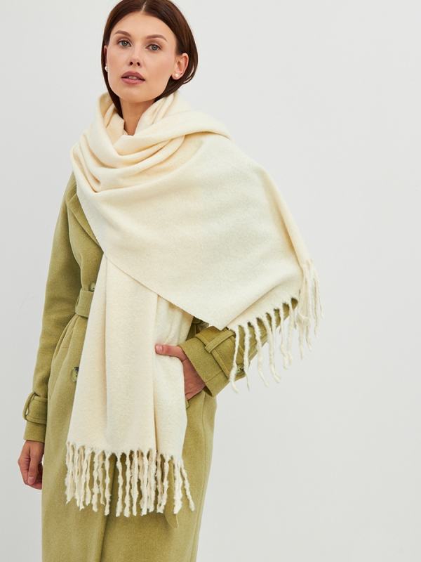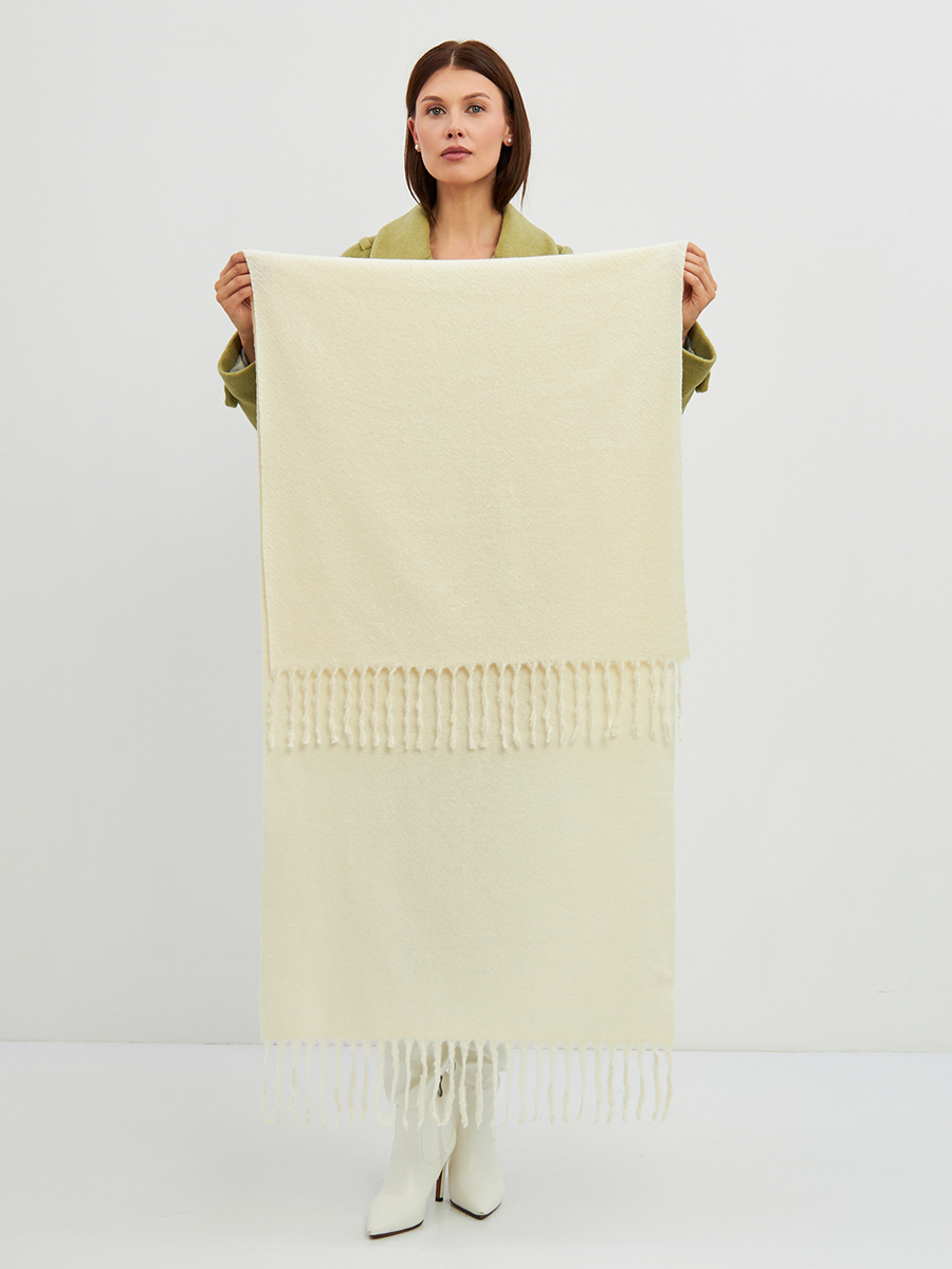 Большой, мягкий, теплый двусторонний однотонный палантин. Края изделия украшены бахромой. Машинная деликатная стирка. Шерсть 10% Модал 55% Вискоза 35%