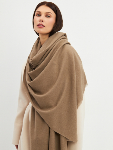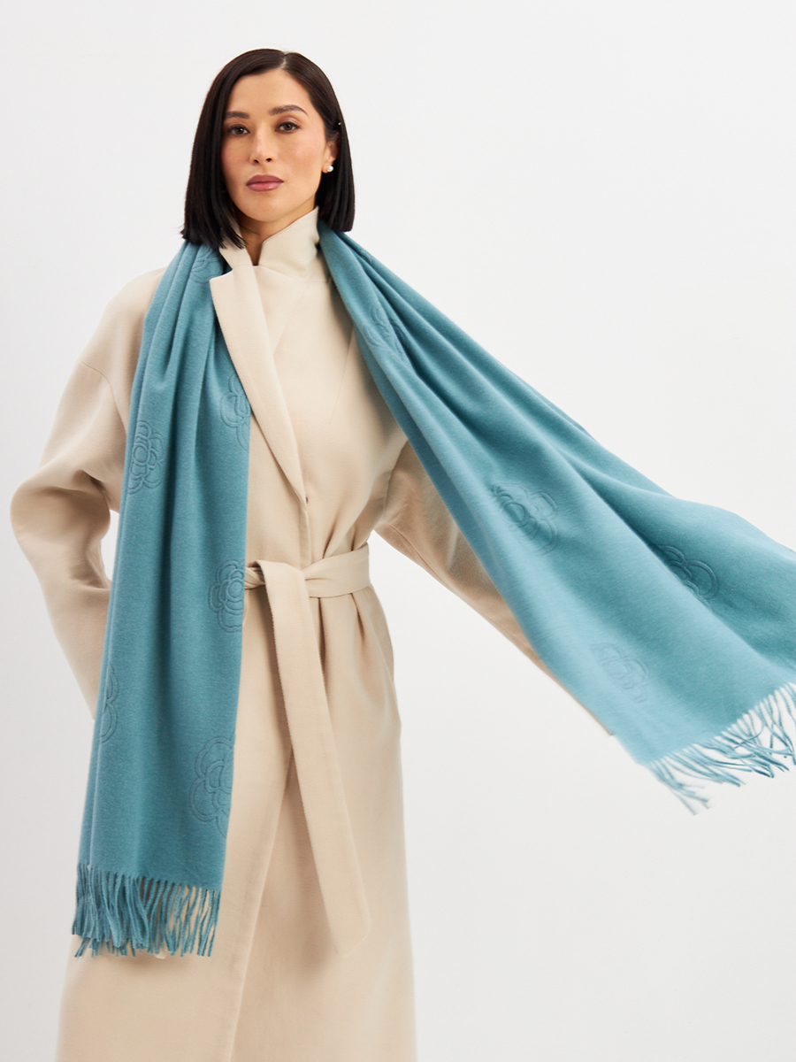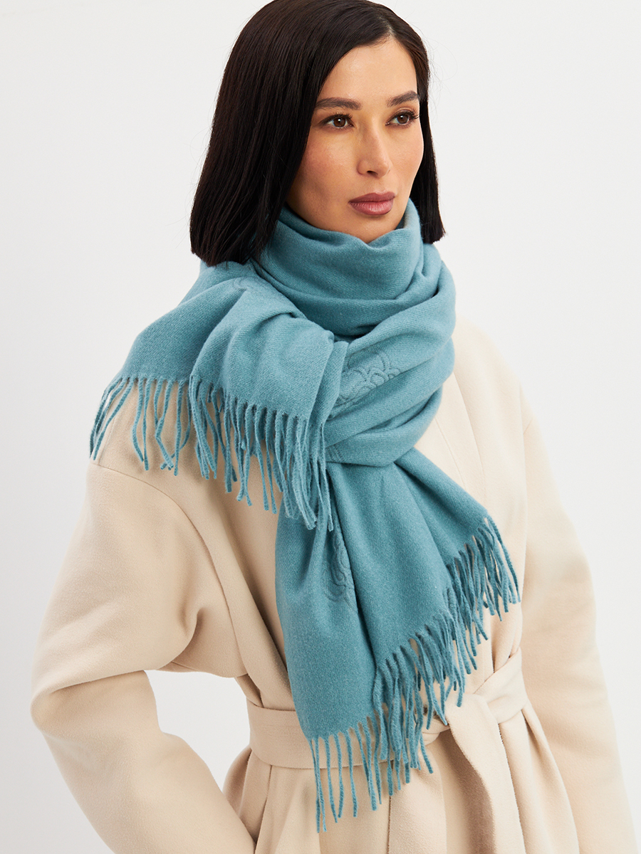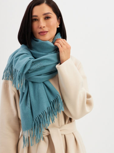 Большой, мягкий, теплый двусторонний однотонный палантин с принтом-печатью. Края изделия украшены бахромой. Машинная деликатная стирка. Кашемир 25% Шерсть 20% Вискоза 55%