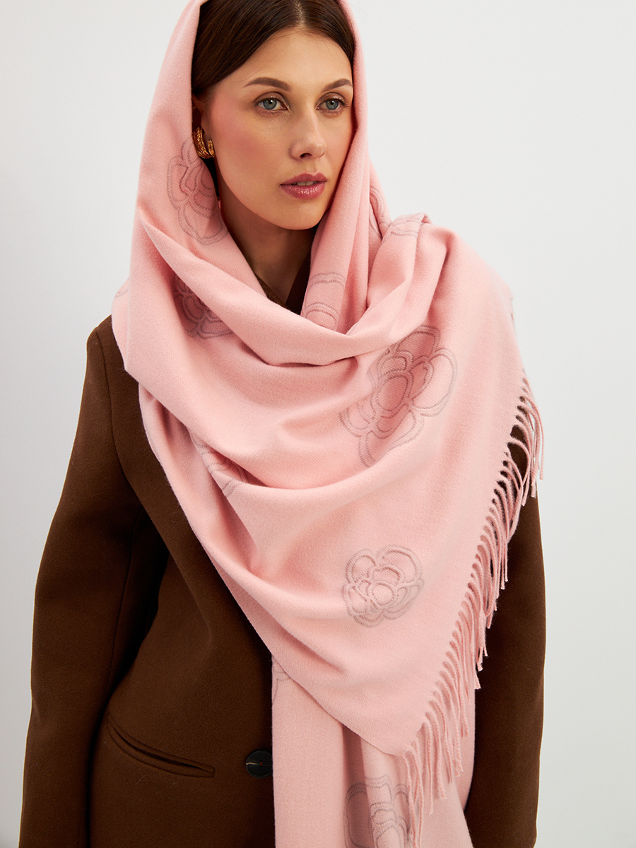 Большой, мягкий, теплый двусторонний однотонный палантин с принтом-печатью. Края изделия украшены бахромой. Машинная деликатная стирка. 55% Вискоза, 25% Кашемир, 20% Шерсть